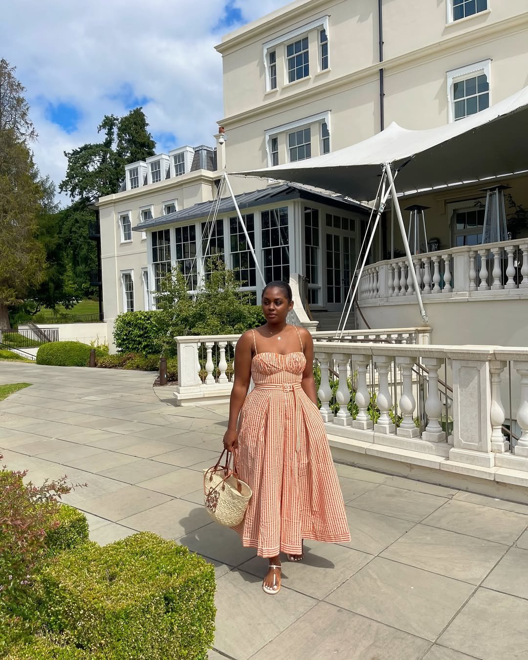 There’s something joyful about it. Soft prints, delicate shoes, and a setting that feels almost too pretty to be real. It’s summer dressing at its most romantic.