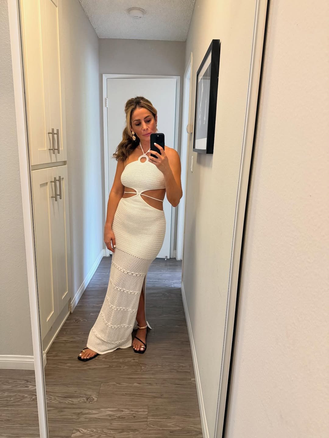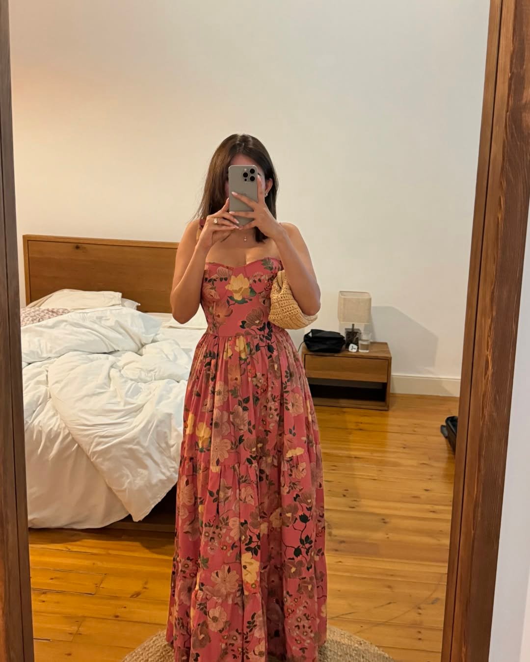 It’s the kind of dress that doesn’t need much styling. A woven bag, soft waves, and a mirror moment are enough to let the silhouette and print carry everything.