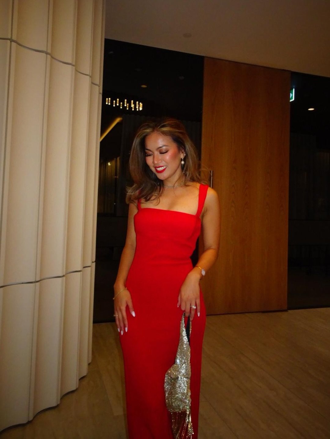 What makes it feel modern is the restraint. Minimal jewelry, a soft glow on the skin, and that delicate metallic bag catching just enough light. It’s the kind of look that doesn’t need a special occasion, it creates one.