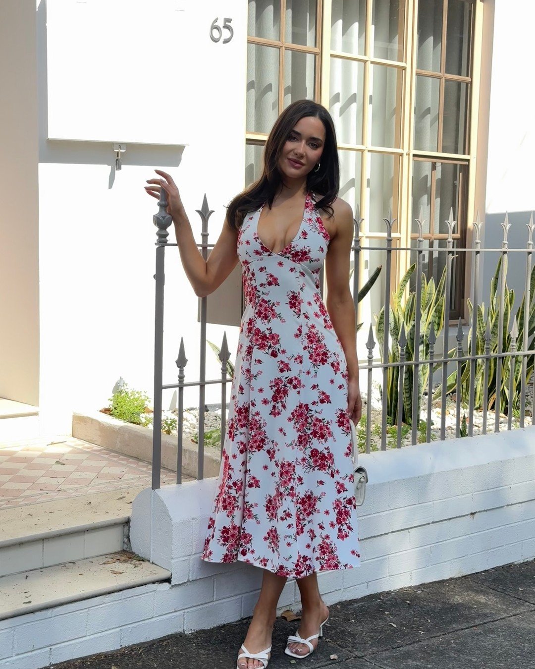A white midi scattered with red florals brings a soft romance that feels easy to wear. The halter neckline frames the shoulders, while the flow of the skirt gives it that light, breezy movement.