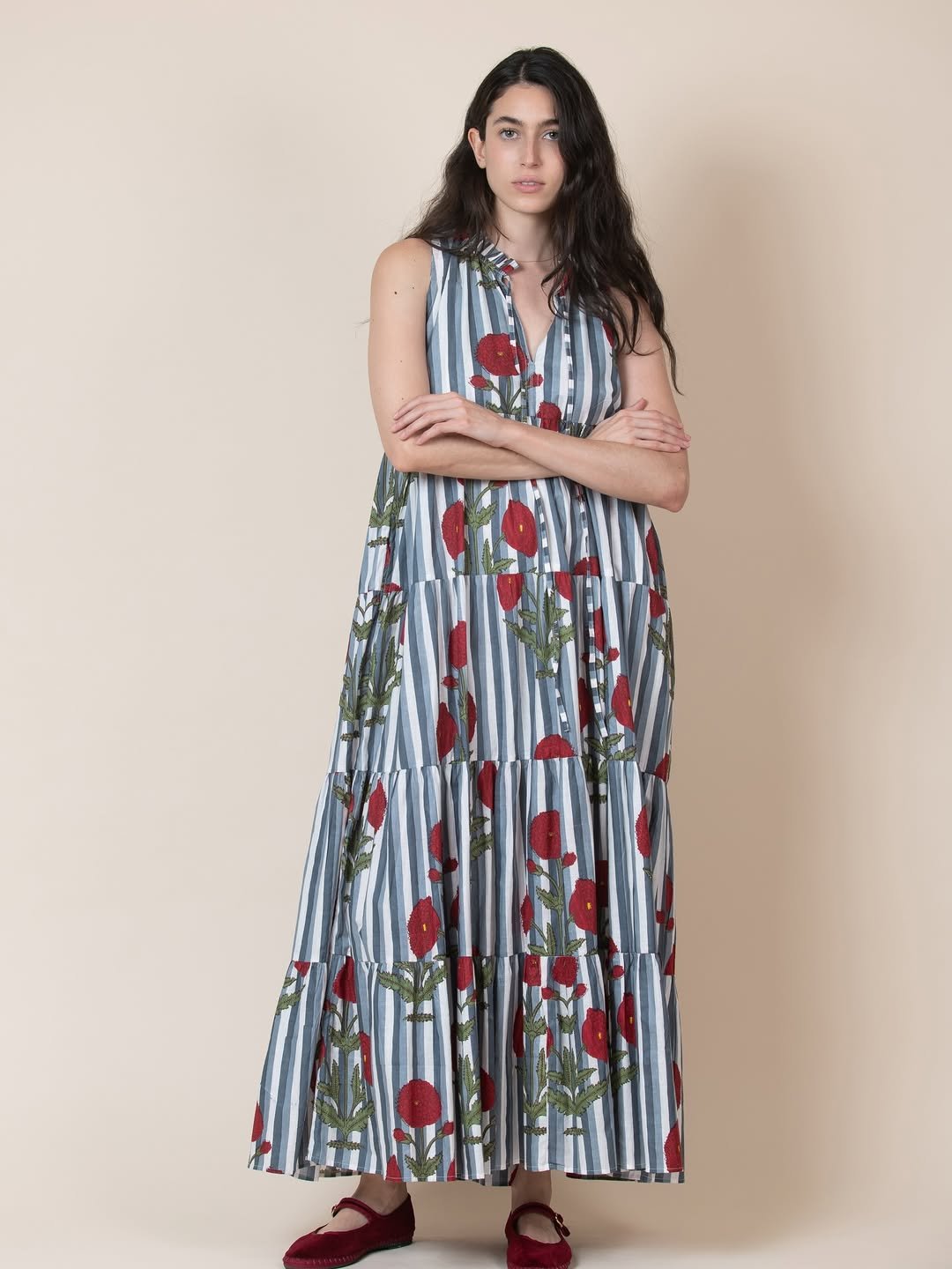 This tiered maxi mixes stripes and florals in a way that feels fresh instead of busy. The relaxed silhouette flows easily, giving it that lived-in comfort without losing its shape.