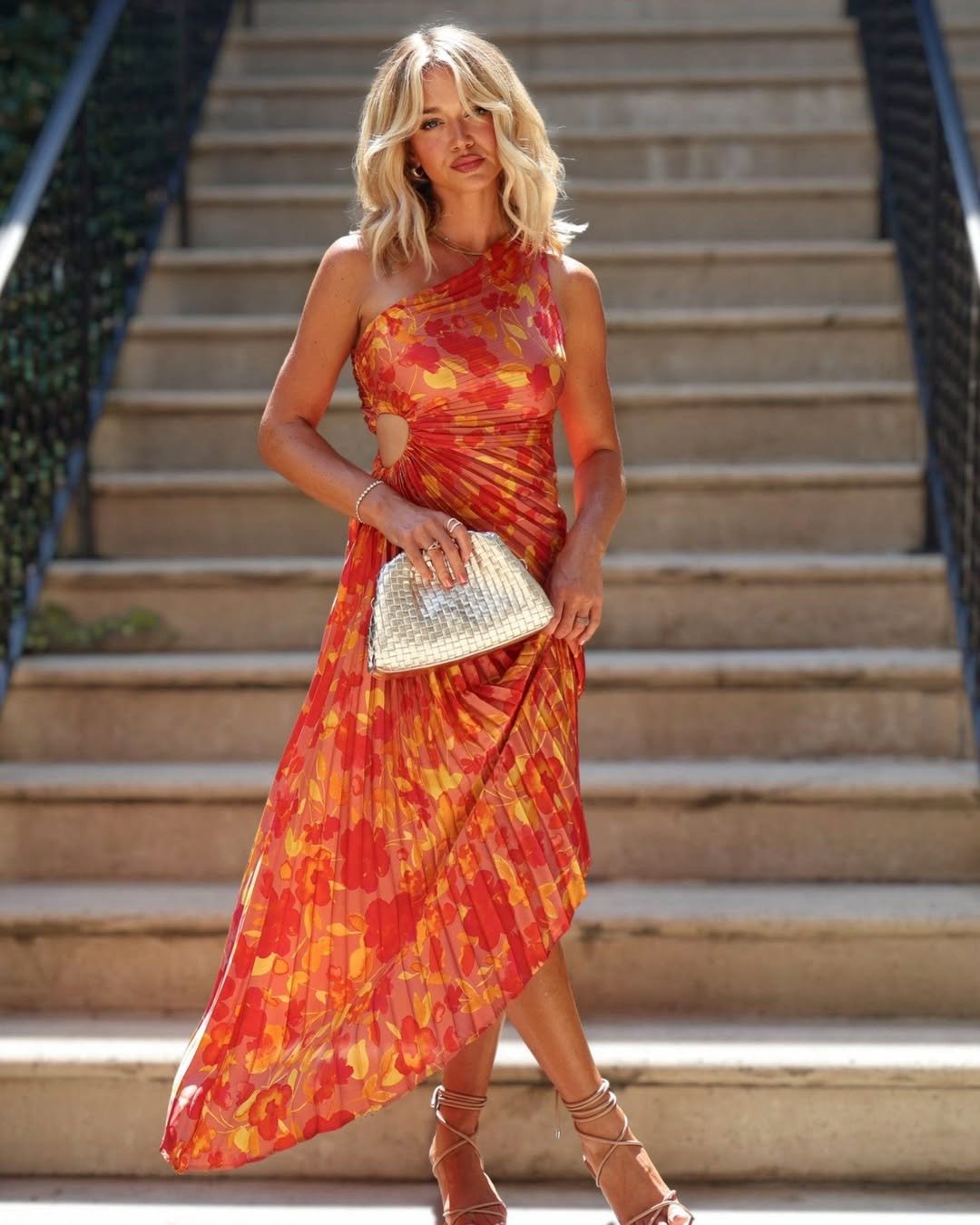It’s bold but still wearable. Think golden hour light, a small woven clutch, and barely-there heels. The kind of look that turns an ordinary evening into something worth remembering.
