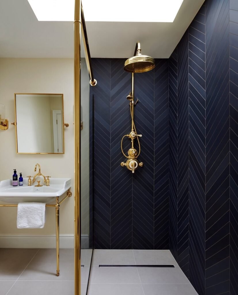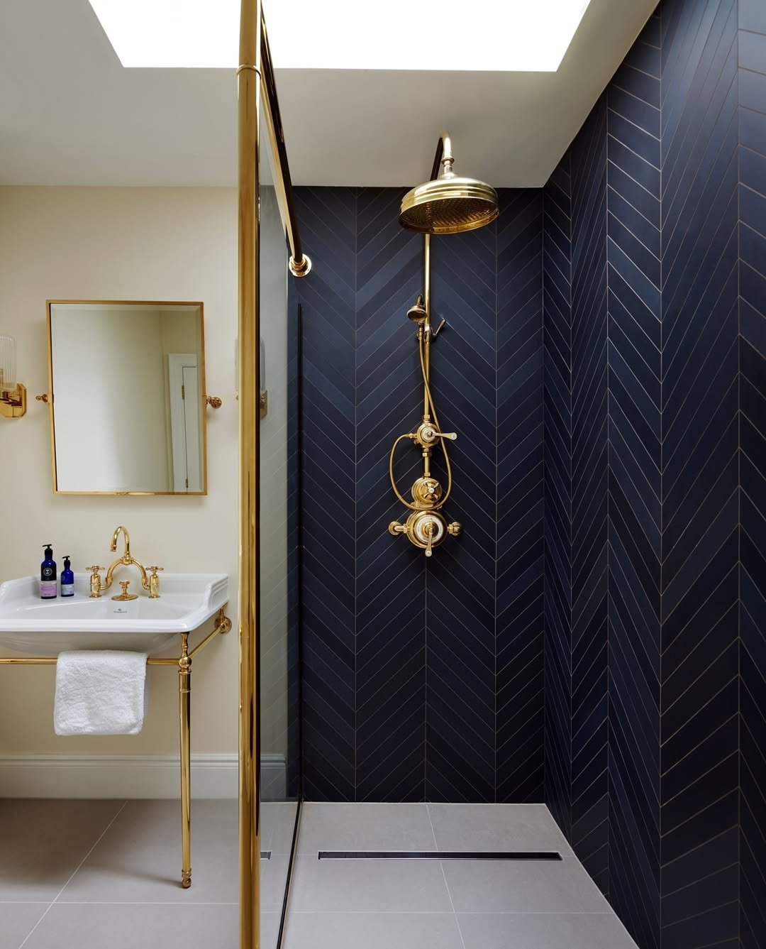 This is where modern meets drama in the best way. The deep navy tiles create such a strong visual moment, especially paired with those gold fixtures—it’s rich without feeling overdone.