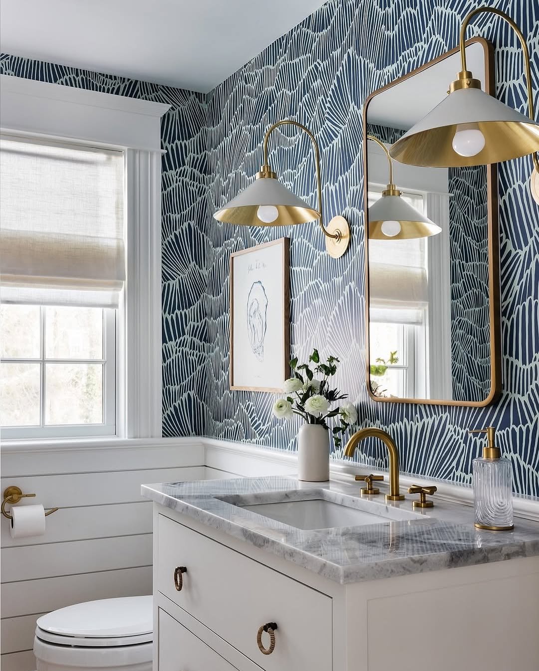 This space doesn’t hold back. The blue patterned wallpaper instantly grabs attention, while the brass fixtures and marble keep it feeling polished.