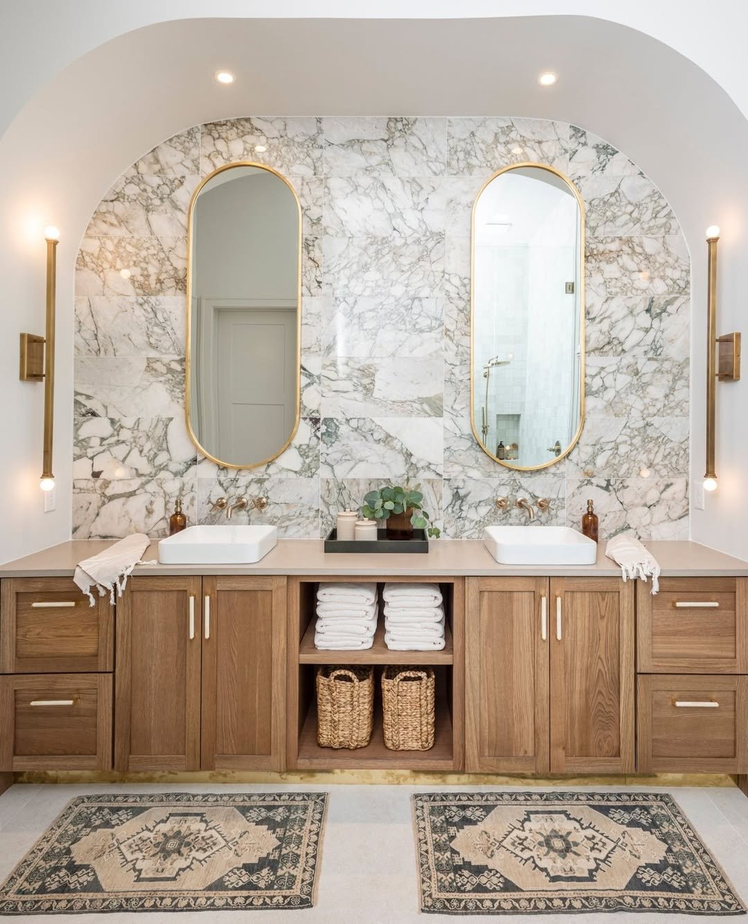 This one feels spacious and intentional right away. The double sinks, arched mirrors, and full marble wall create a strong focal point that instantly reads as “designed.”