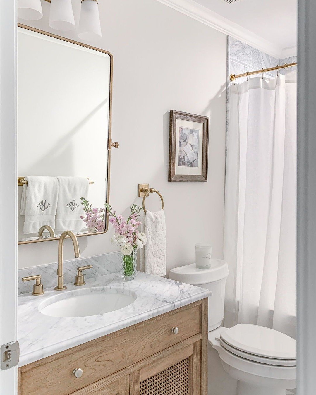 There’s something about this space that just feels elevated. The soft marble, warm brass, and natural light create a look that’s airy but still refined.