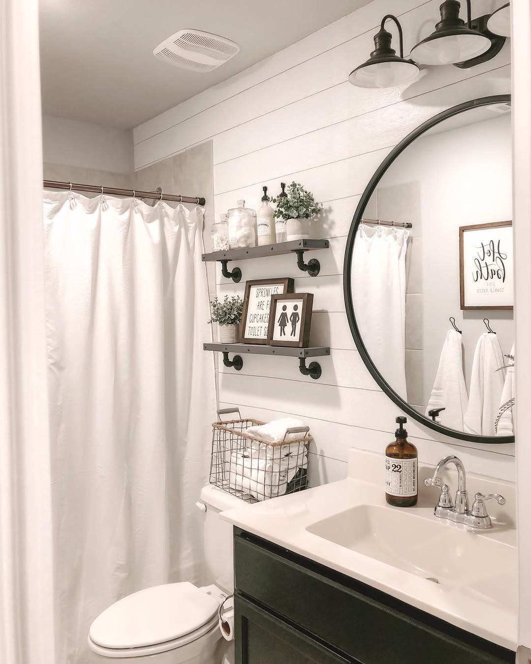This space leans into that cozy farmhouse feel, but keeps it updated. The black vanity, open shelving, and round mirror give it that modern edge.