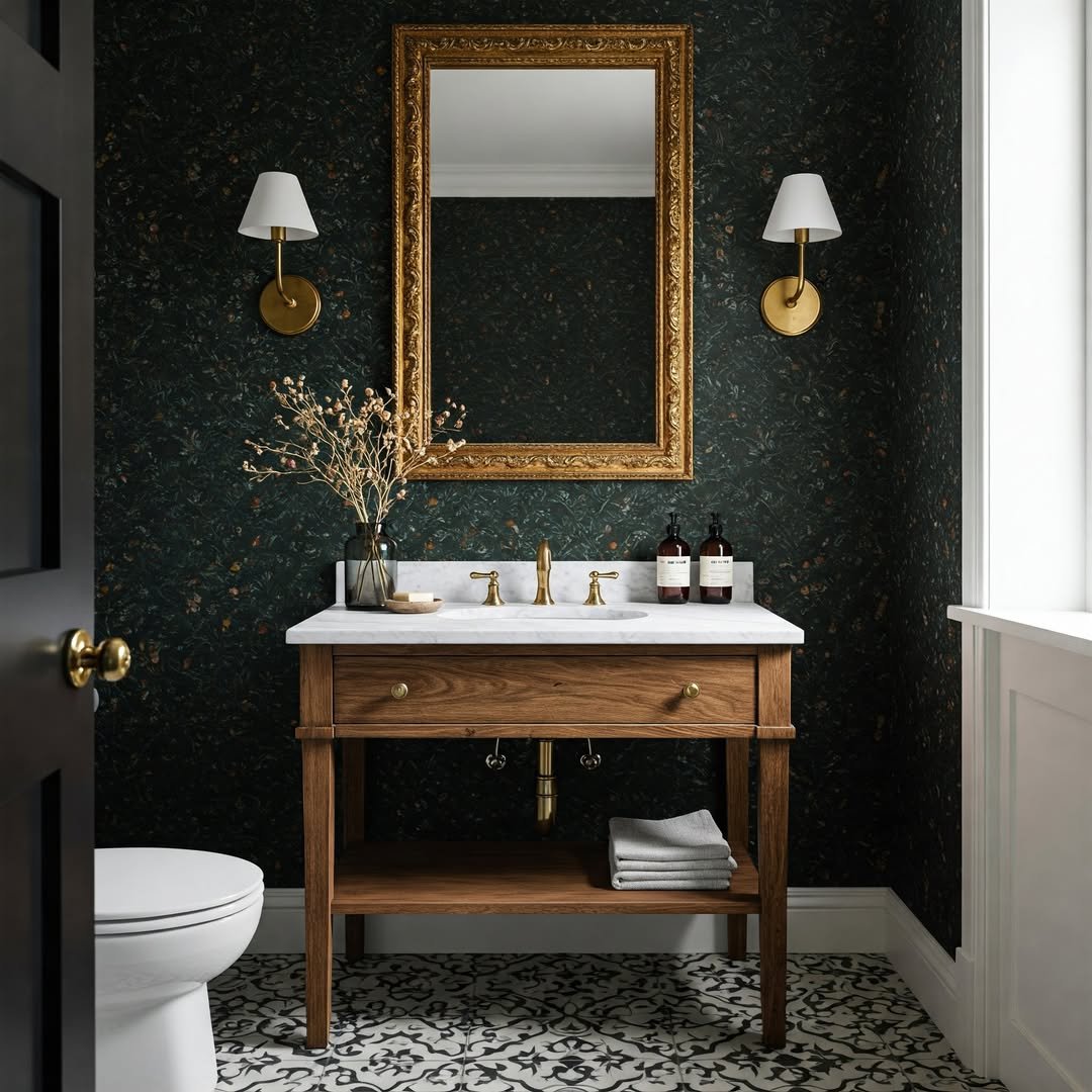 Now this is a bold move—and it pays off. The dark wallpaper instantly adds depth and mood, while that gold mirror and warm wood vanity keep it from feeling too heavy.