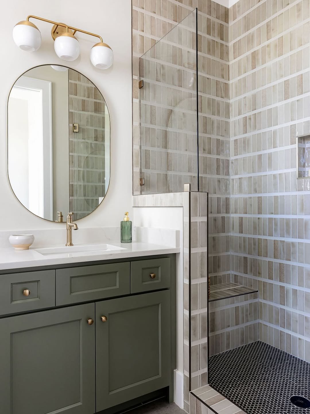 This one hits that perfect middle ground between classic and fresh. The muted green vanity adds just enough color without taking over, while the soft white tiles keep everything feeling bright and clean.