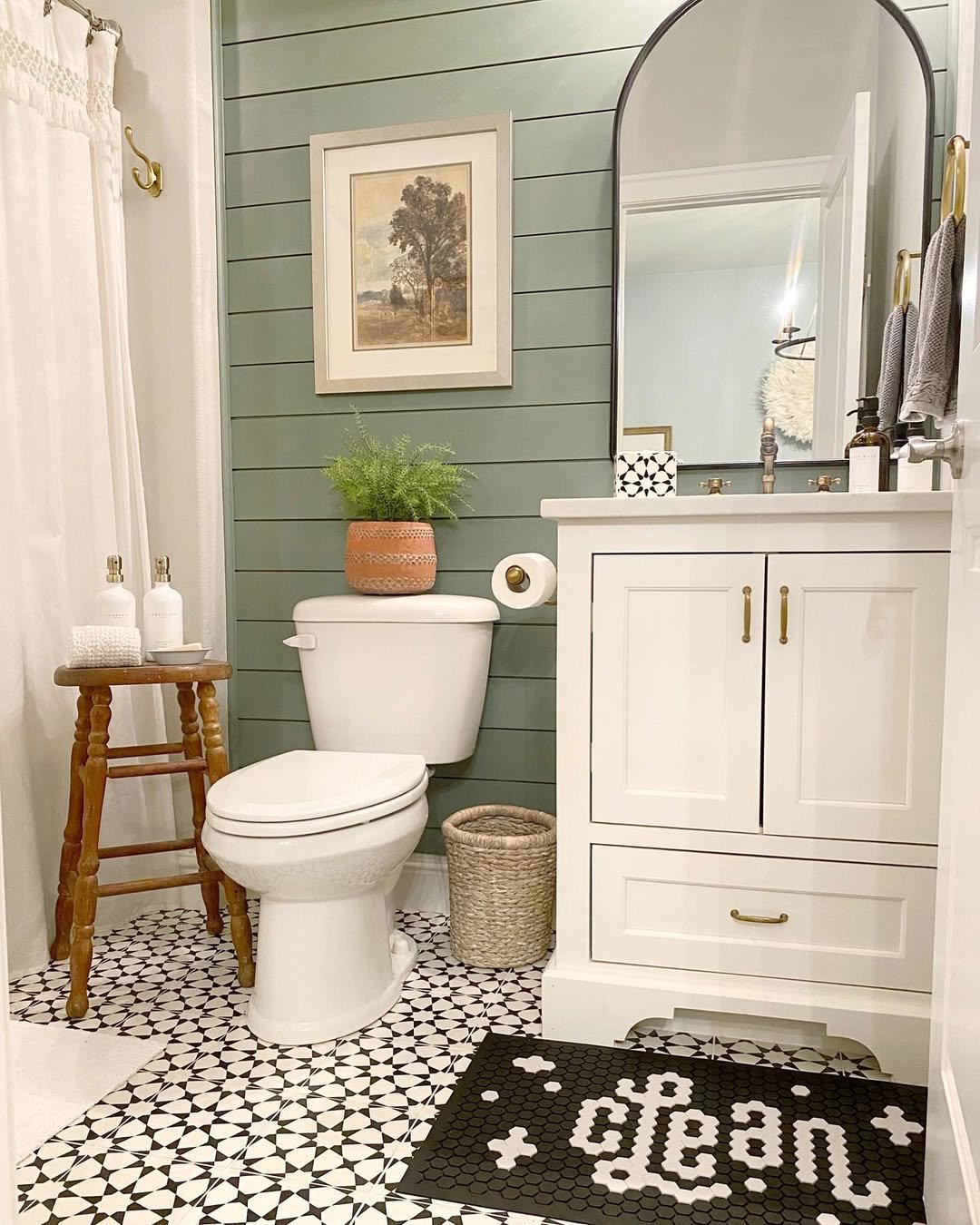 This space has that collected, slightly nostalgic feel—but still feels current. The green shiplap wall, classic vanity, and mixed textures create so much character.