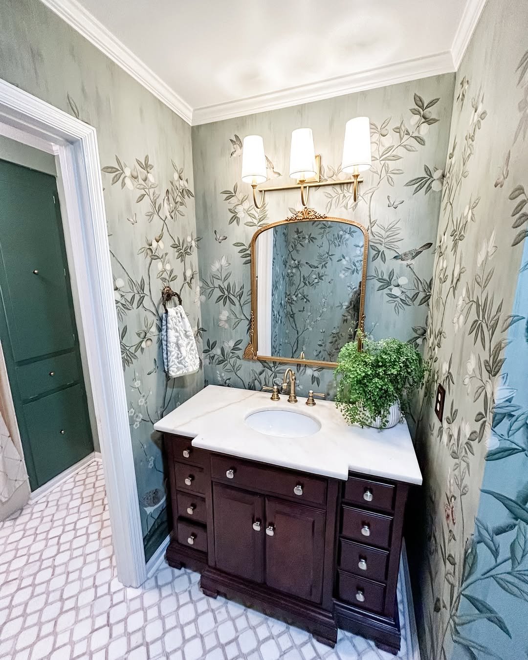 This one leans into personality in the best way. The soft green wallpaper adds movement and detail, while the classic vanity keeps it grounded.