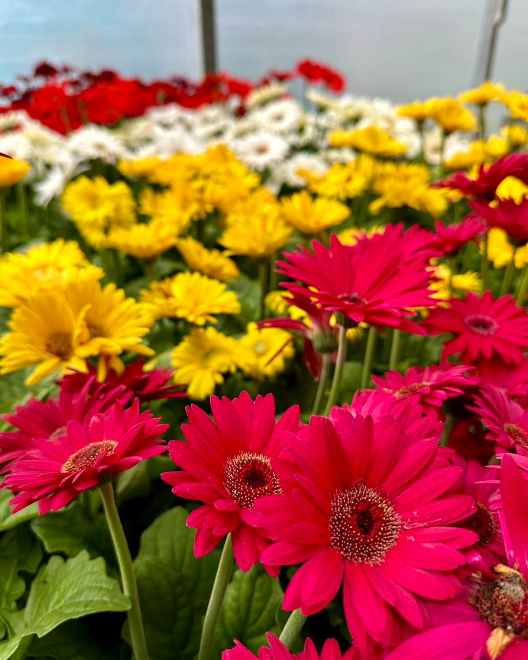 Bright gerbera daisies in reds and yellows stretch out in rows, creating a sea of color that feels joyful and energetic. There’s something about these saturated tones that instantly lifts the mood.
