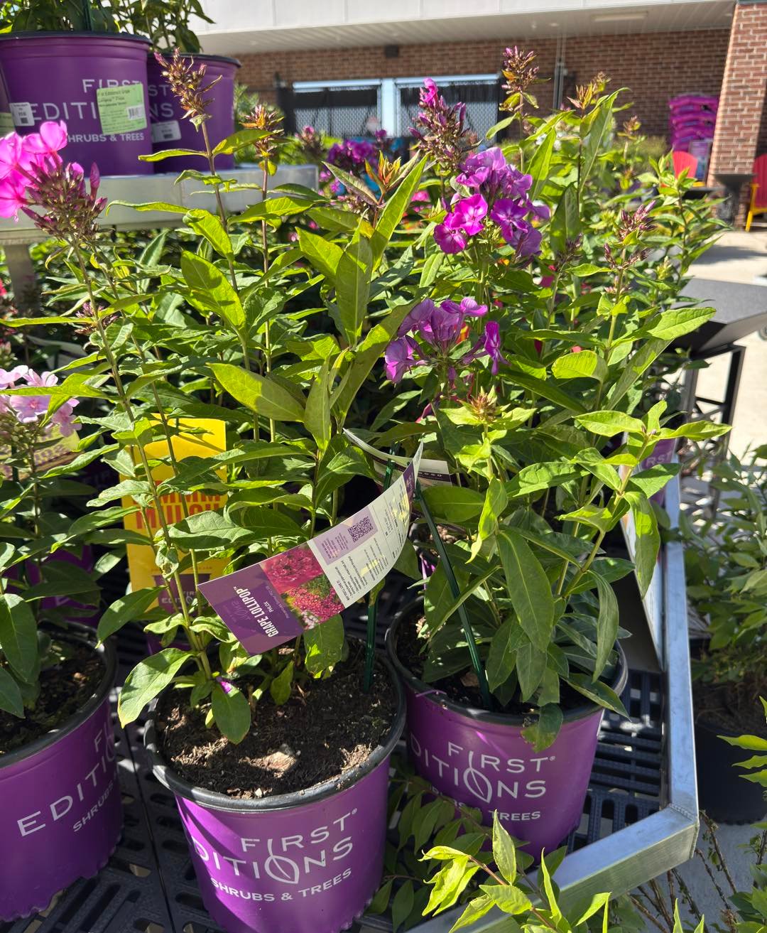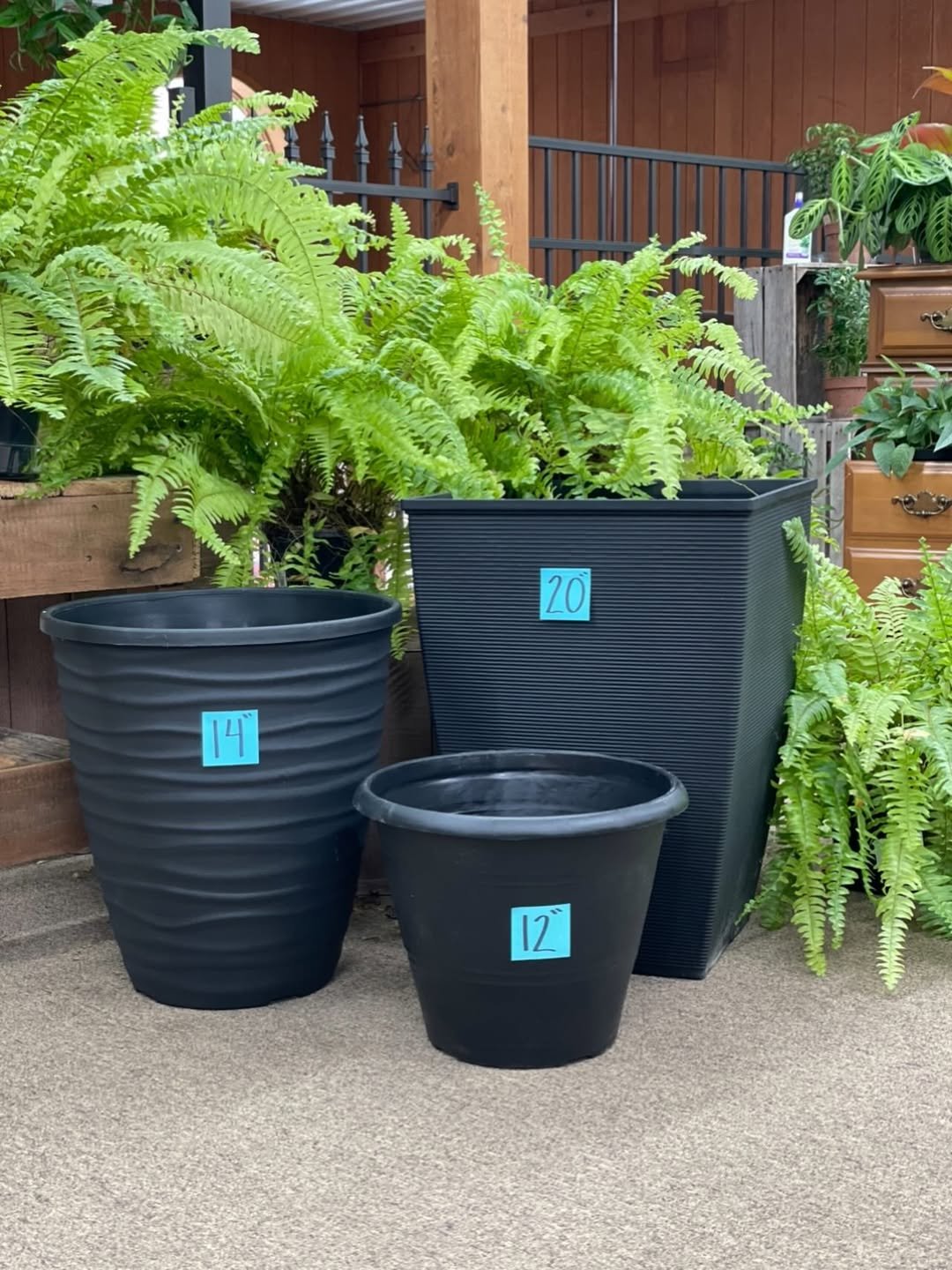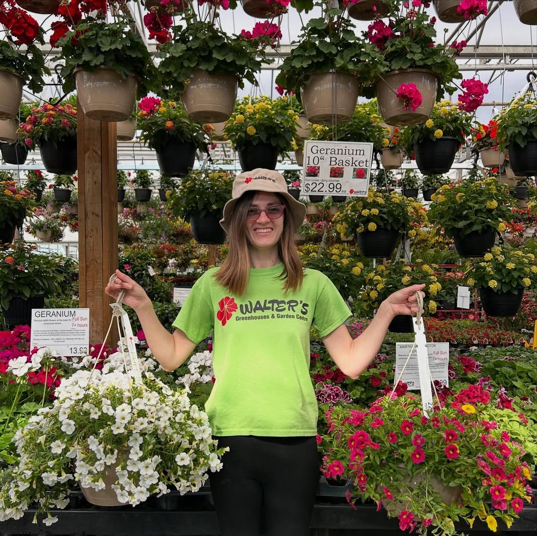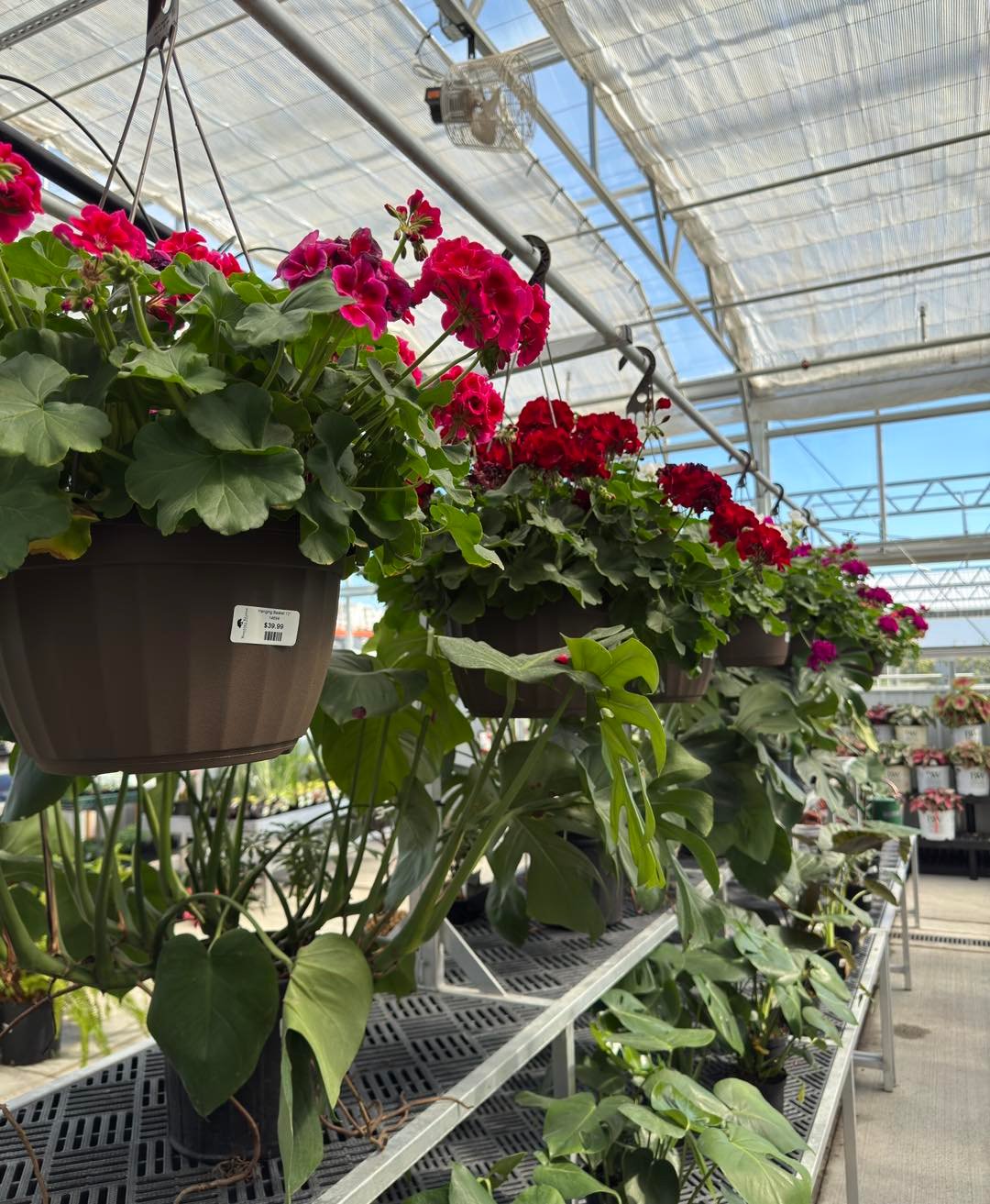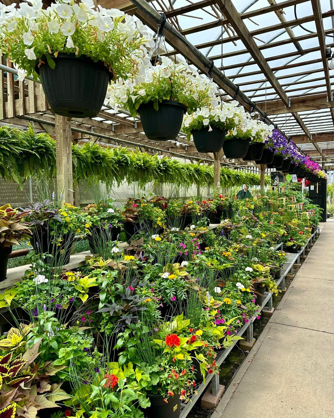 Walking through rows of mixed planters feels like stepping into a secret garden. Layers of textures, ferns above, trailing blooms below, and little pops of color tucked in between.