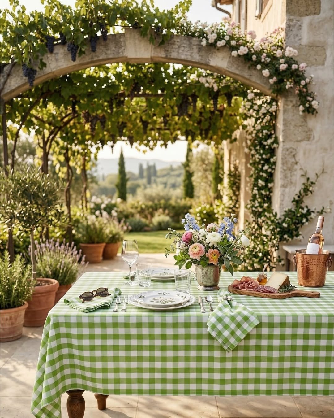 This setup feels like a slow afternoon waiting to happen. A green gingham tablecloth, soft florals at the center, and that dreamy vine-covered arch overhead, it all comes together in a way that feels relaxed yet intentional.