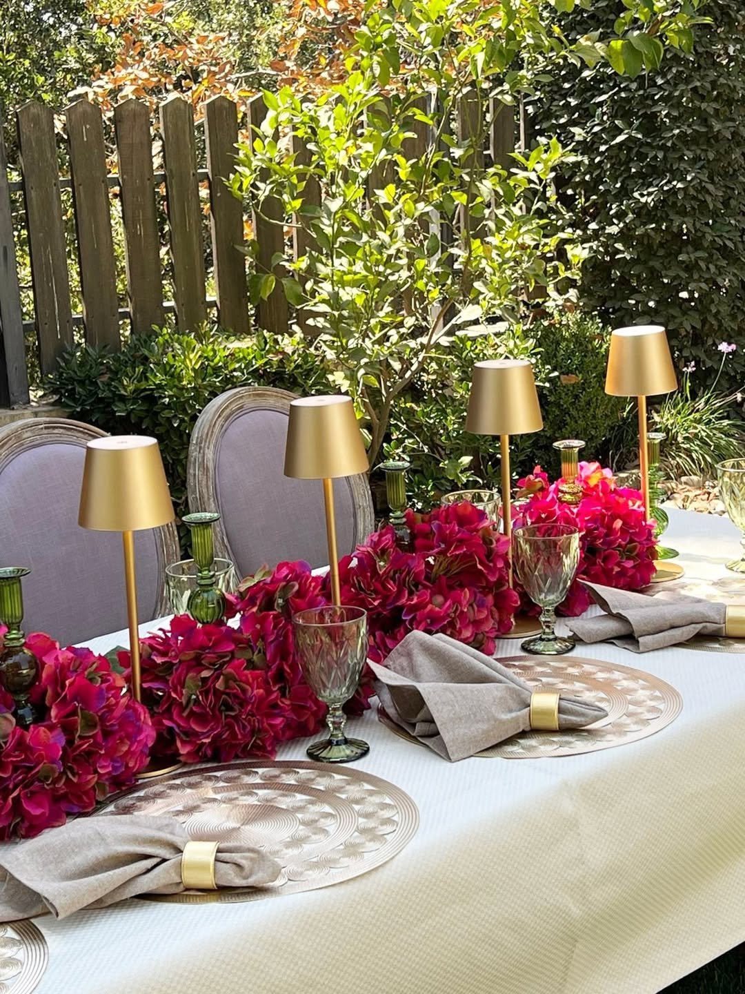 This table leans a bit more elevated. Deep pink blooms paired with warm gold accents and soft neutrals create a setting that feels both fresh and refined.