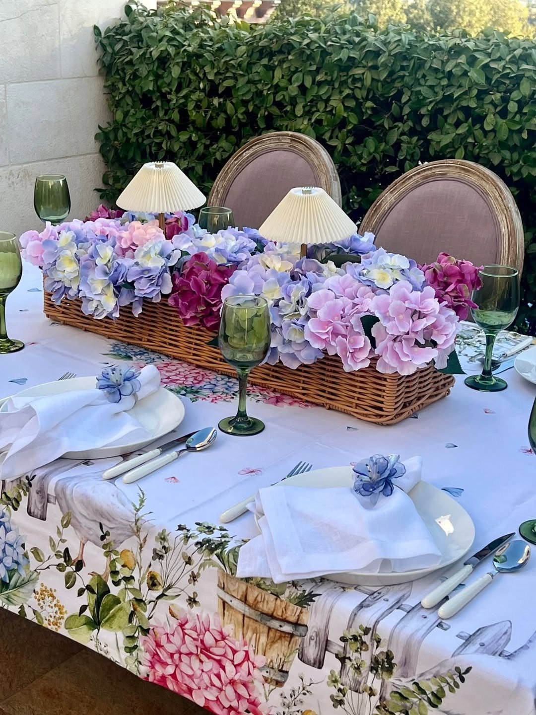 A woven basket overflowing with pastel hydrangeas stretches across the table like a garden brought indoors. The soft blues, pinks, and lilacs feel gentle, almost watercolor-like against the crisp white setting.