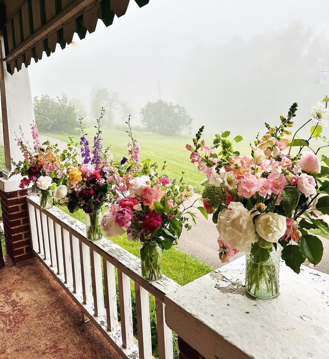 There’s a story in every jar here. Glass vases lined along a weathered railing, each one spilling over with peonies, snapdragons, and garden roses in that perfectly undone way. The fog in the background softens everything, making the colors feel even richer, like a painting that’s just slightly out of focus.