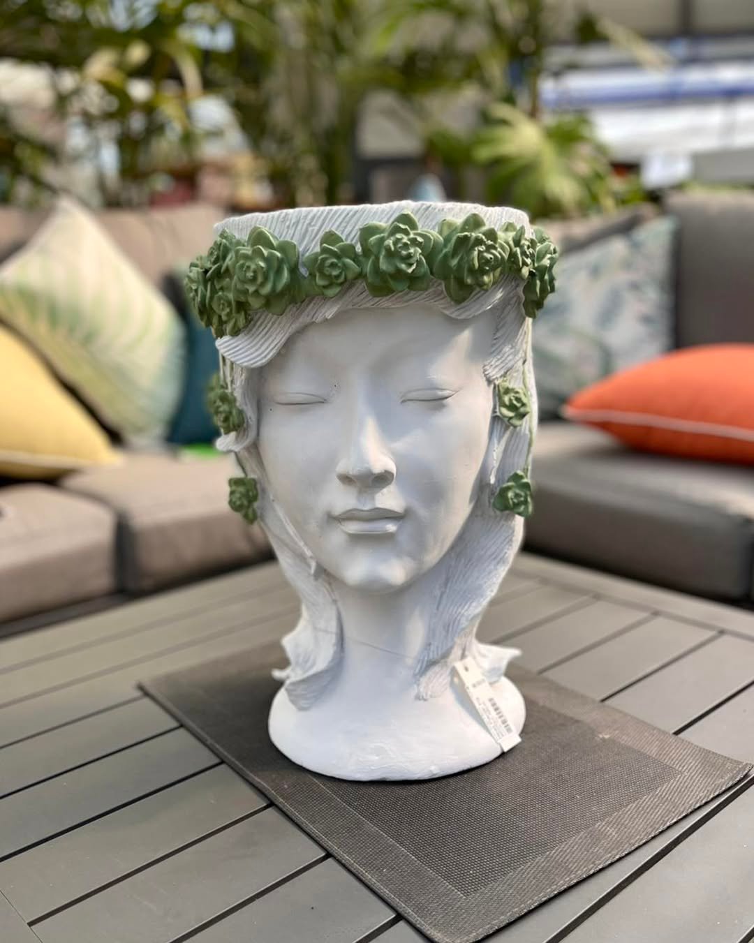 This piece feels like it belongs in a quiet corner of an old European garden. A soft, sculpted face crowned with tiny green florals, sitting still as if it’s part of the landscape itself. There’s something calming about it, almost like it invites you to slow down just by being there.
