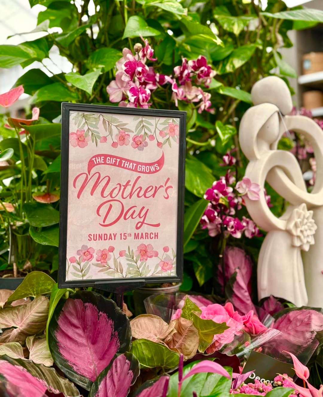 A small framed sign tucked between lush greenery and soft pink blooms instantly sets the tone. It feels thoughtful without being overdone, like a quiet nod to the day rather than a full production. The layered leaves and delicate florals create a backdrop that makes even the simplest message feel meaningful.