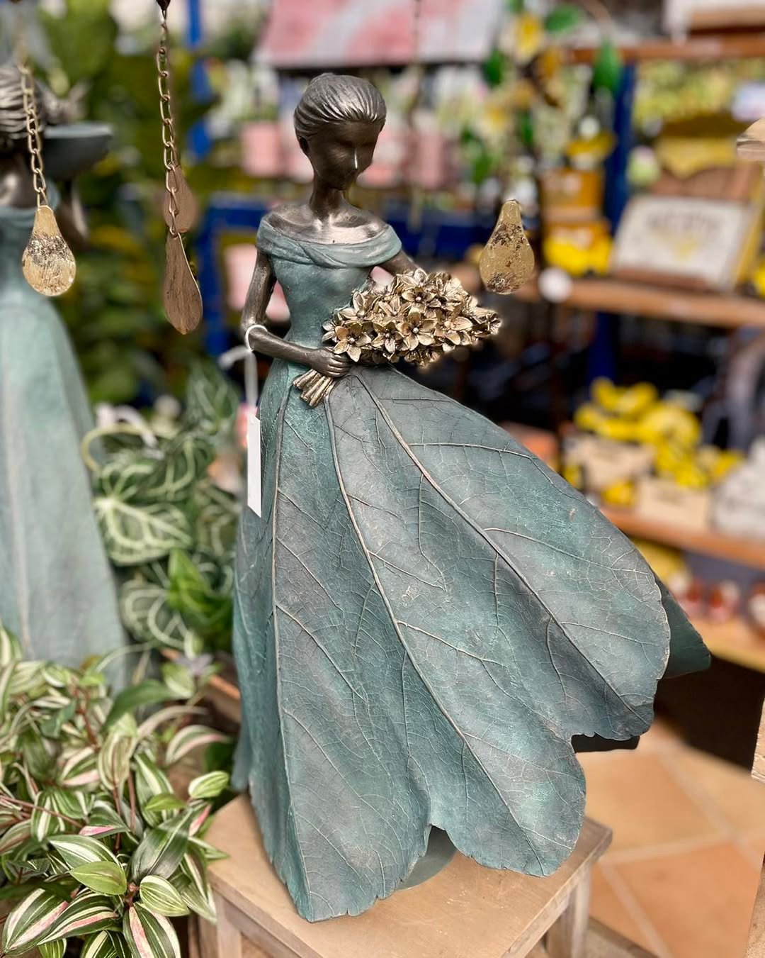 A delicate figure holding a bouquet, her dress shaped like a leaf, feels like something pulled from a fairytale. The muted greens and soft metallic tones keep it grounded, never too whimsical, just enough to spark curiosity.