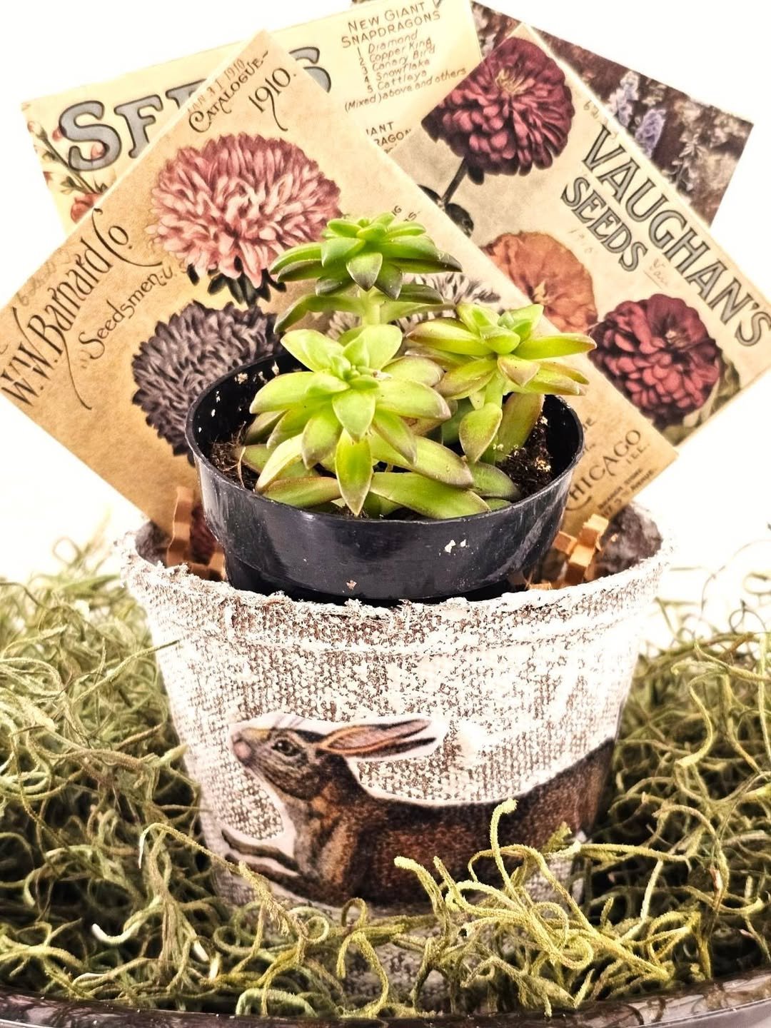 A small succulent paired with aged seed packets creates a quiet little vignette that feels nostalgic in the best way. The textures do most of the work here, worn paper, soft greenery, and that slightly chipped planter.
