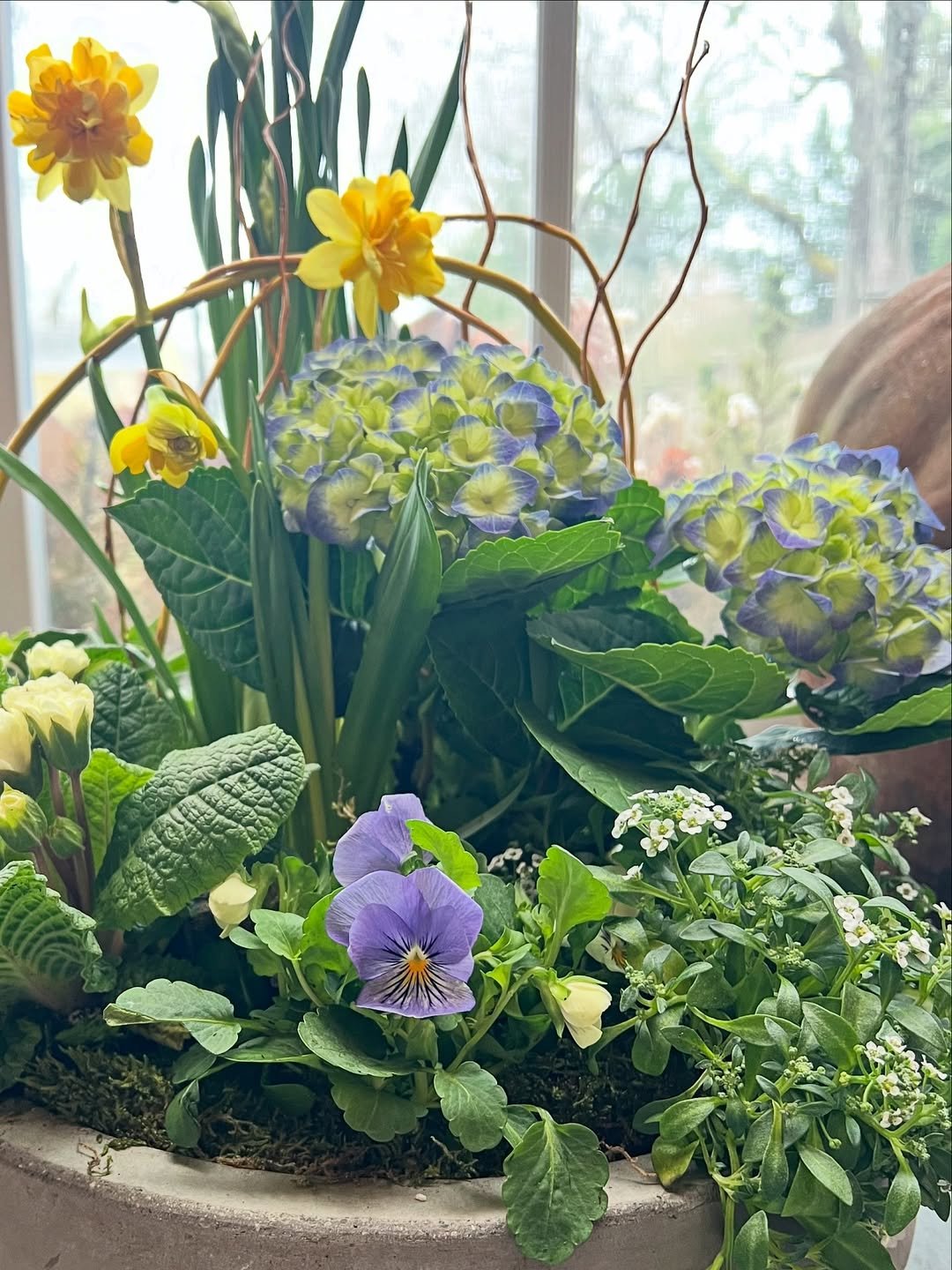 This arrangement feels like a tiny landscape. Hydrangeas, daffodils, pansies, all layered together in a way that feels natural rather than arranged.