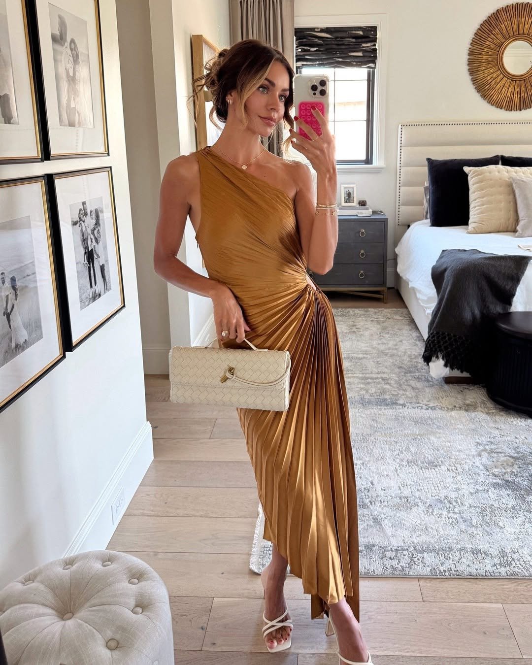 Sleek, sculpted, and just a little bit dramatic, this draped one-shoulder dress feels like a modern classic. The warm bronze tone adds richness, while the pleating creates movement without overwhelming the silhouette.