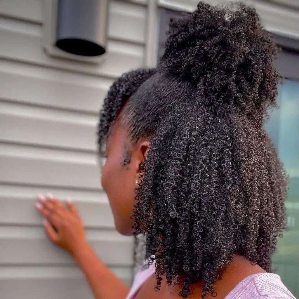 This half-up look lets the natural curl pattern truly shine. The top section adds height and structure, while the loose, defined curls in the back create a soft, springy cascade. It’s giving carefree confidence — the kind you carry into a sunny afternoon.