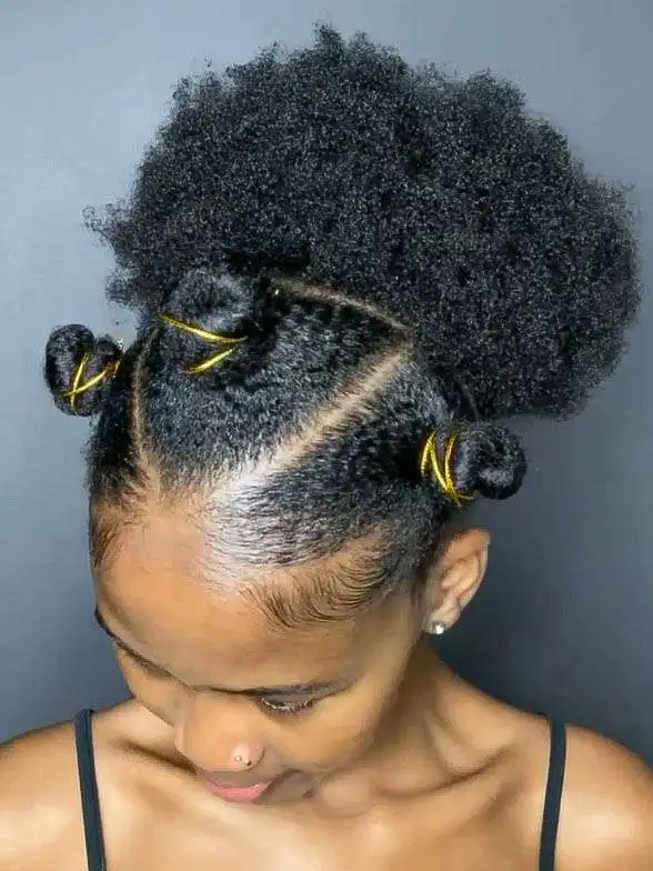 The small, banded knots up top give this style a playful twist, literally. Paired with the soft, cloud-like puff behind it, the look becomes this fun blend of edgy and soft.