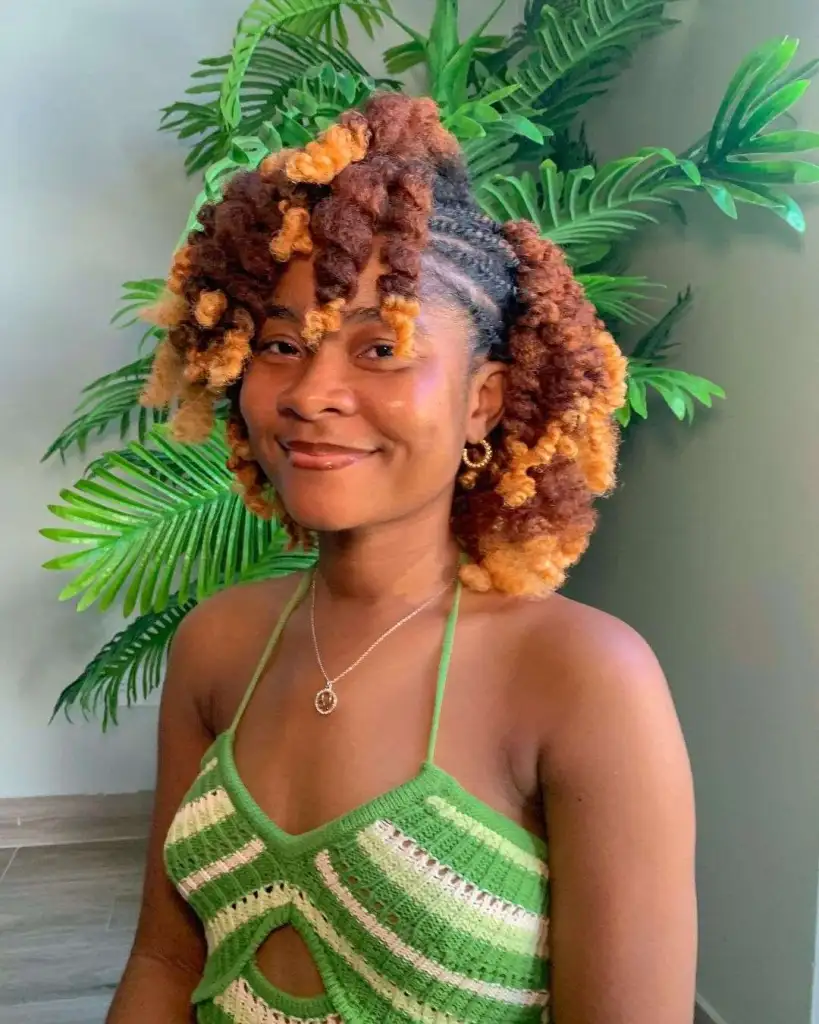 These warm, bouncy curls pair so beautifully with the precision of clean cornrows. The copper-tipped ends brighten everything up, giving the style a sunlit, joyful energy that feels perfect for warm weather and easy weekends. It’s playful without ever losing its polish.
