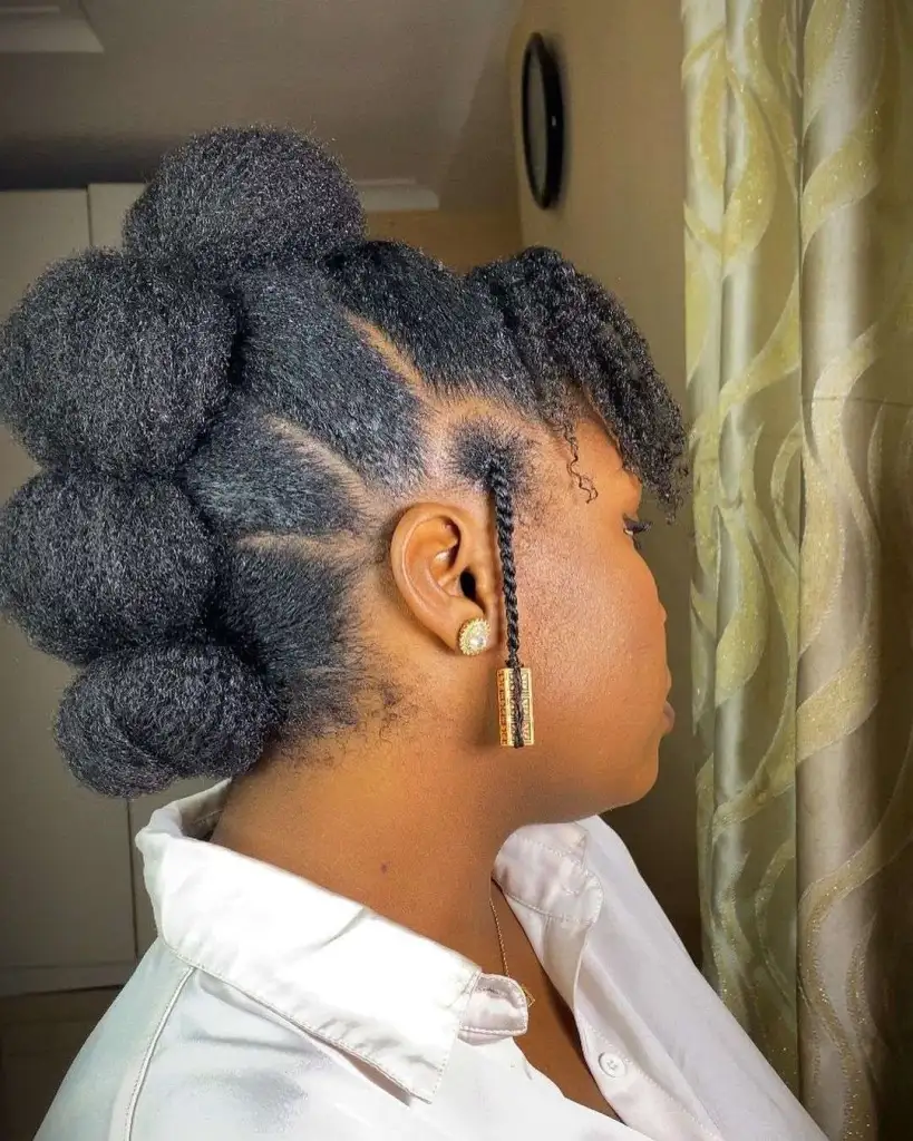 There’s something so regal about this sculpted bubble style — almost like a modern crown made entirely of coils. Each rounded section is perfectly shaped, creating this soft, cloud-like silhouette that feels playful and polished all at once. It’s the kind of style that makes you want to sit a little taller, even on a casual day.