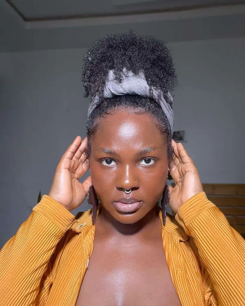This high puff is giving easy weekend glow—fresh skin, soft definition, and curls gathered in a way that feels both carefree and intentional. The headwrap tucked underneath adds that cozy-cool vibe, almost like a lived-in accessory that ties the whole look together.