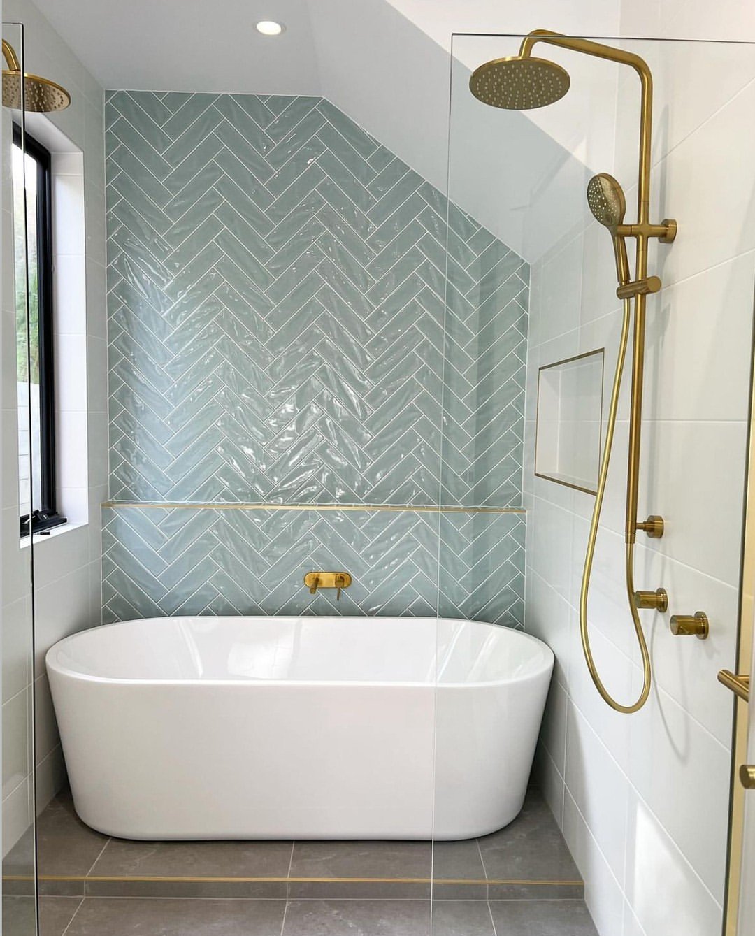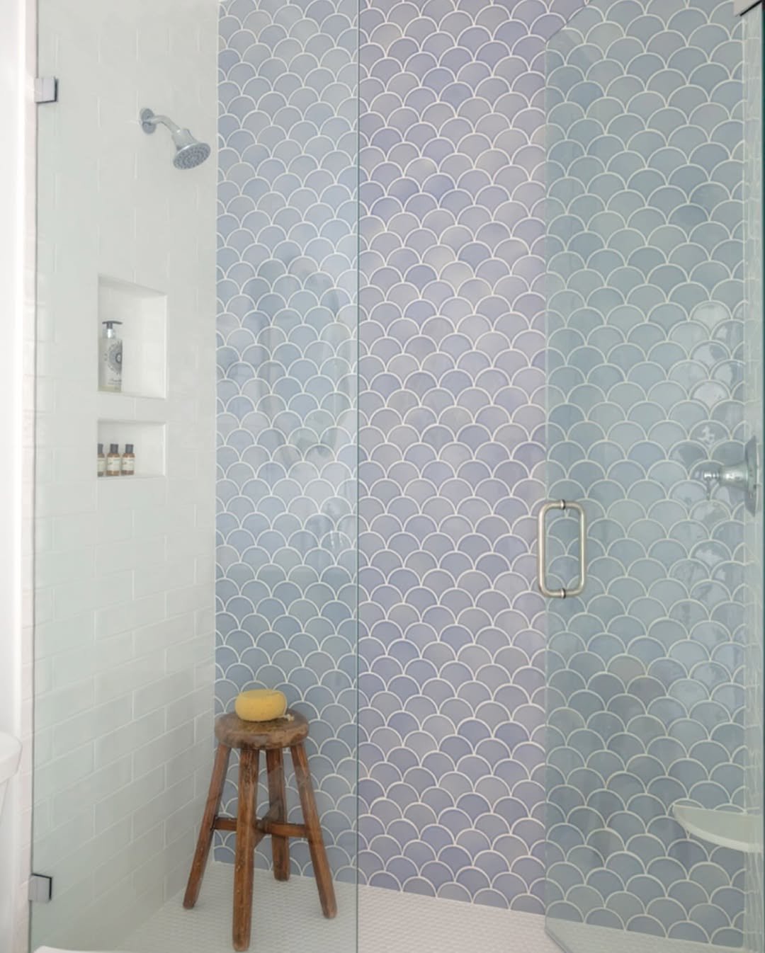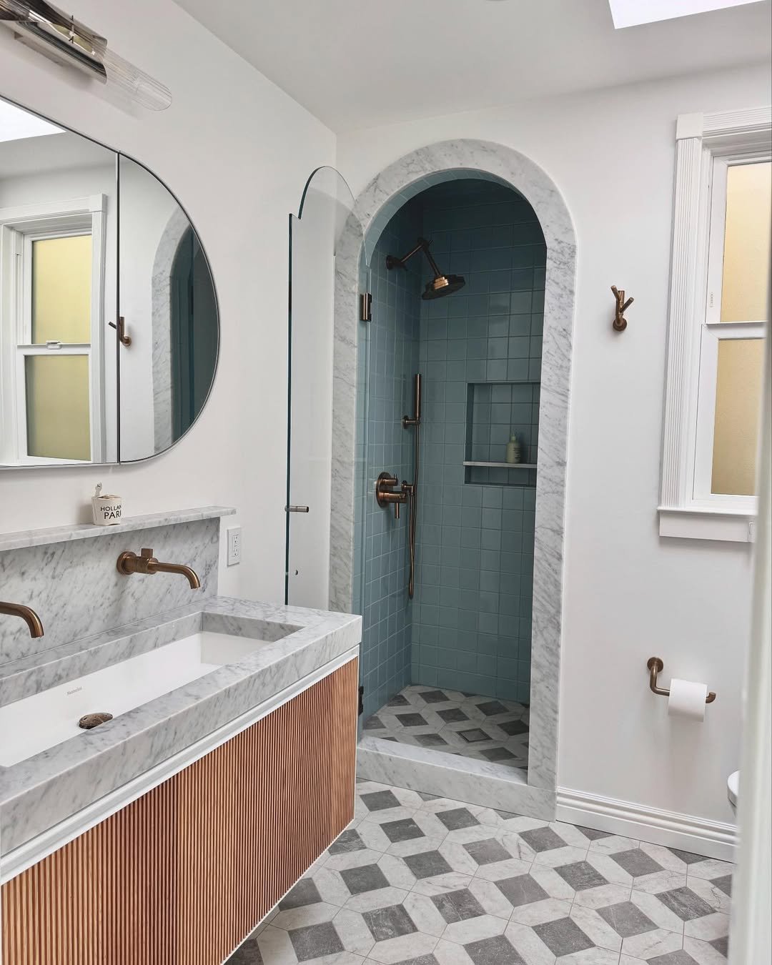 The arched shower alone is enough to stop you scrolling. Add in the soft blue tiles and marble framing, and it feels like a hidden spa by the sea.