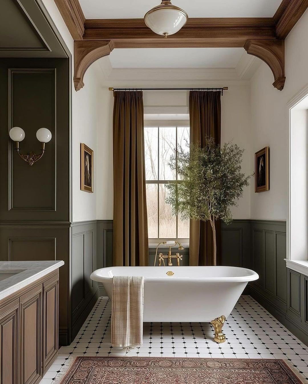 This space leans more traditional, but still keeps that coastal undertone. The paneling, soft tones, and centered tub create a really balanced, grounded feel.