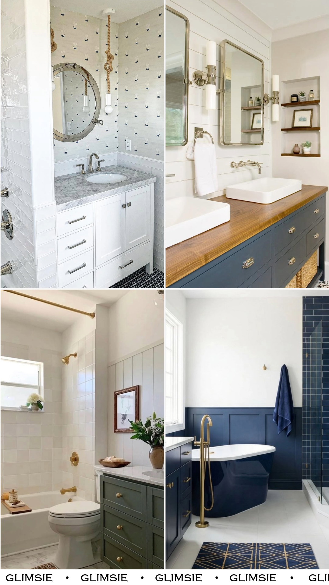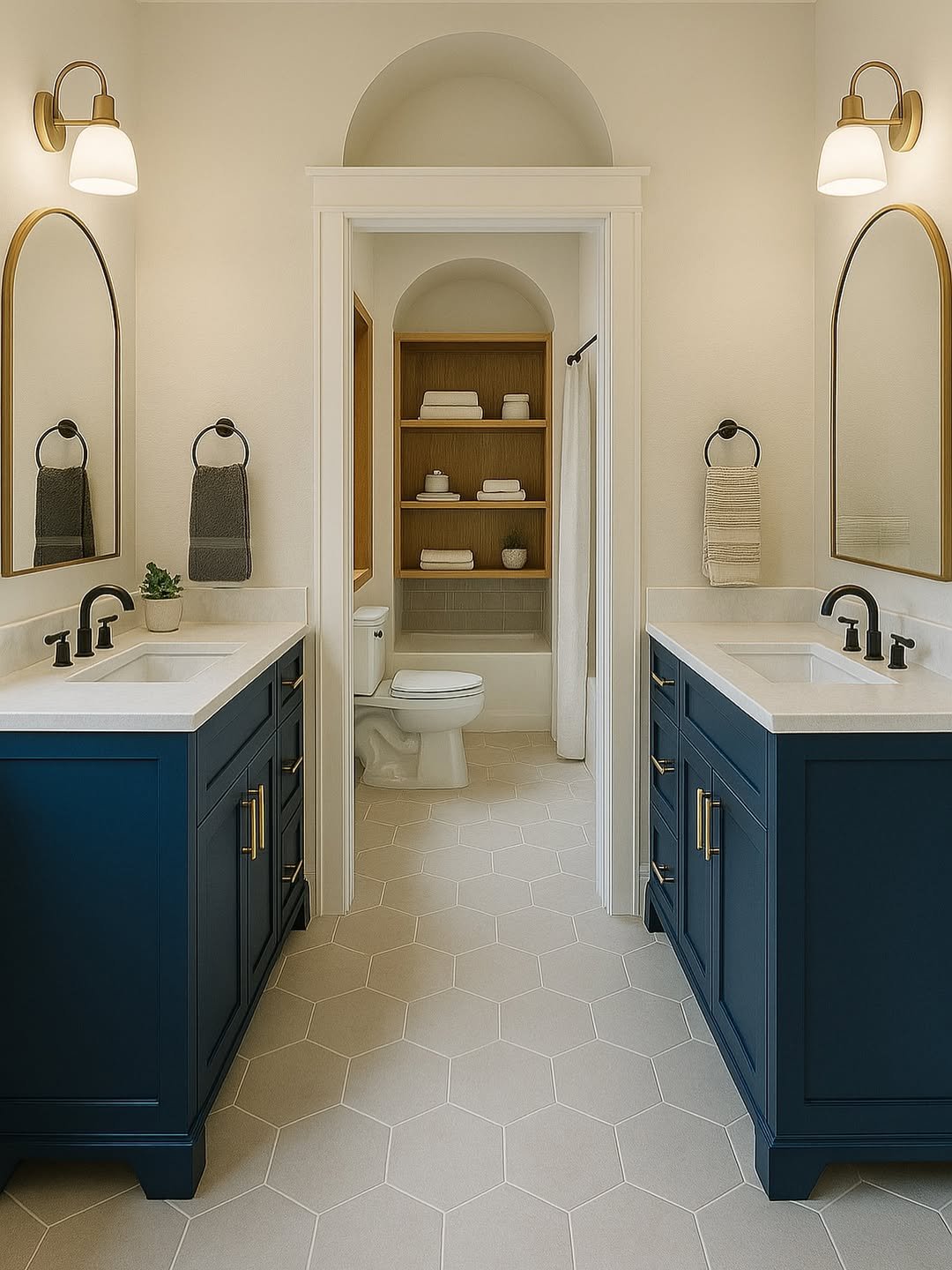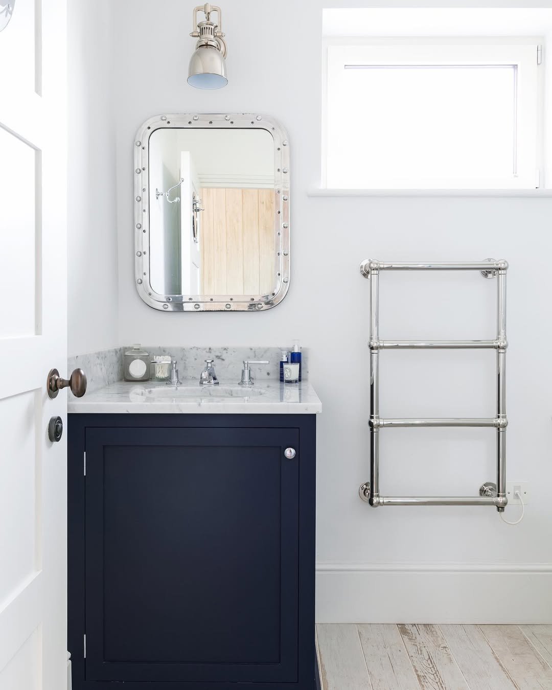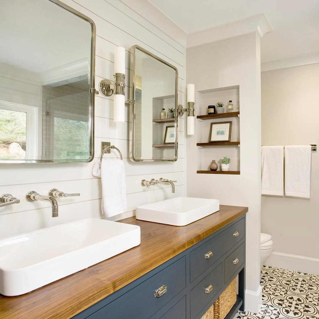 There’s something about this one that just exhales. Clean white paneling, soft tones, and that navy vanity grounding everything perfectly.