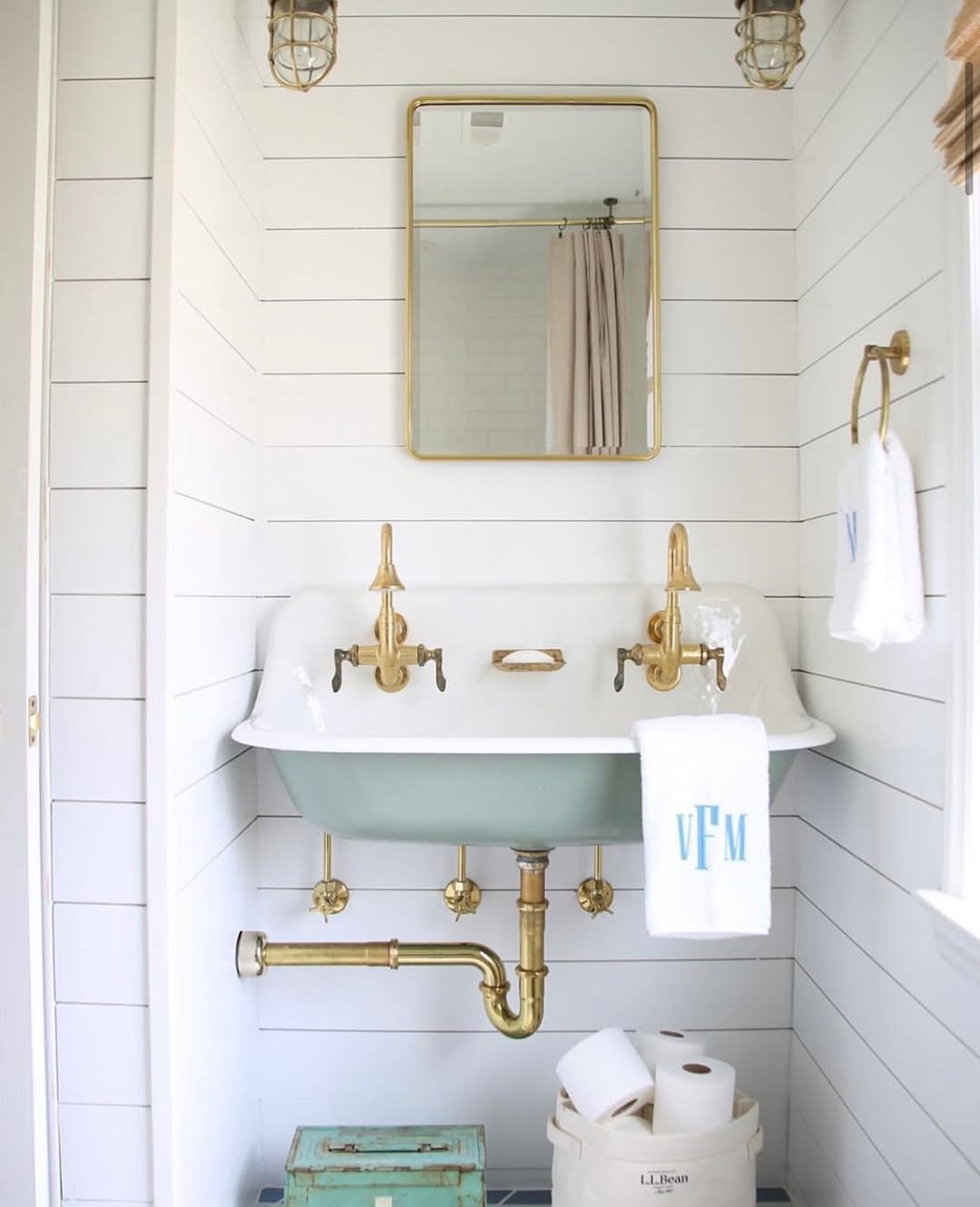 This one leans fully into that traditional coastal look. The soft palette, structured sink, and brass details feel timeless and polished.