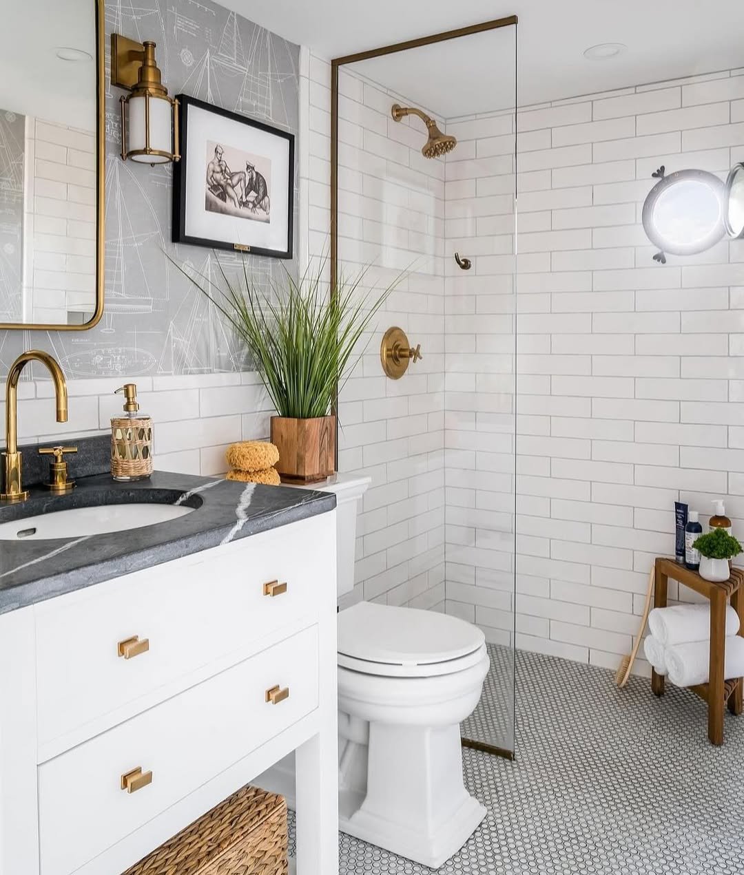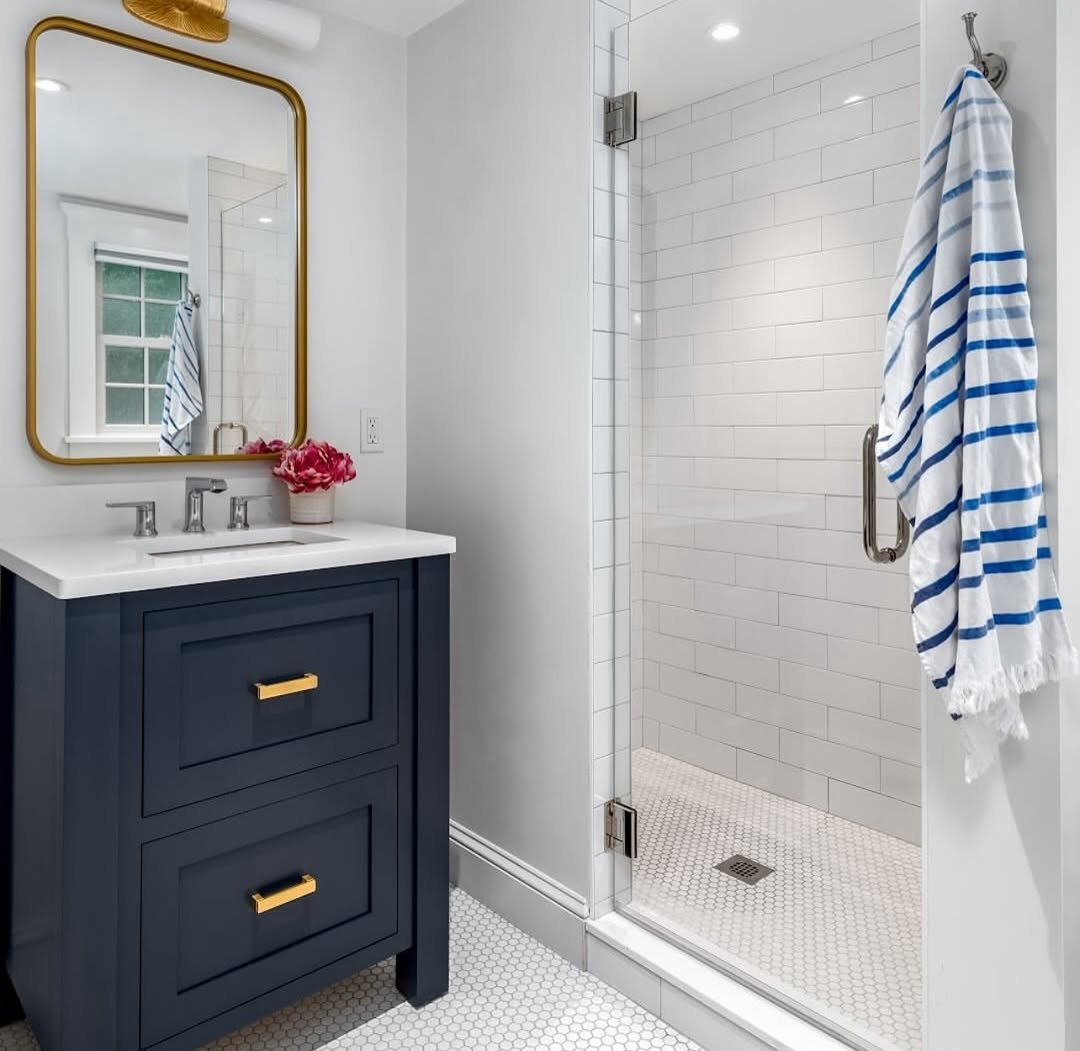 That navy vanity against crisp white tile? Always a win. The gold mirror adds just enough warmth to keep it from feeling too stark.