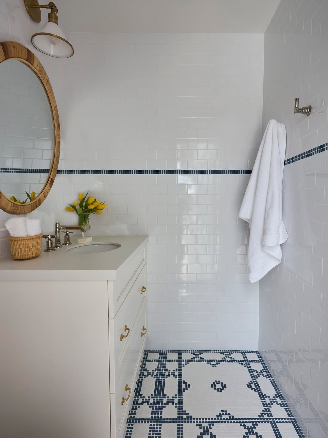 White tile, subtle blue detailing, and that woven mirror—it’s simple, but it hits every note perfectly.