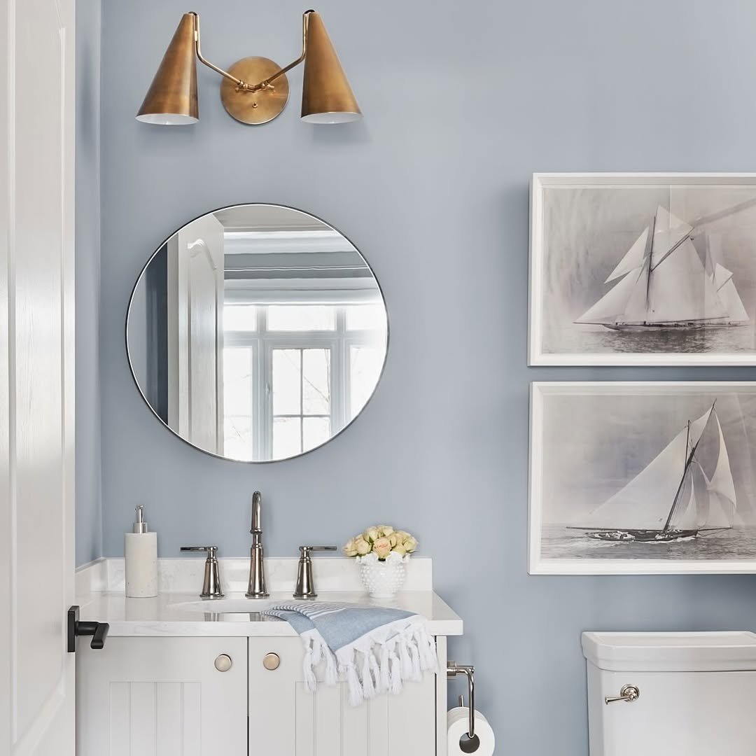 Soft blue walls, minimal decor, and those framed sailboats—this one keeps things simple in the best way.