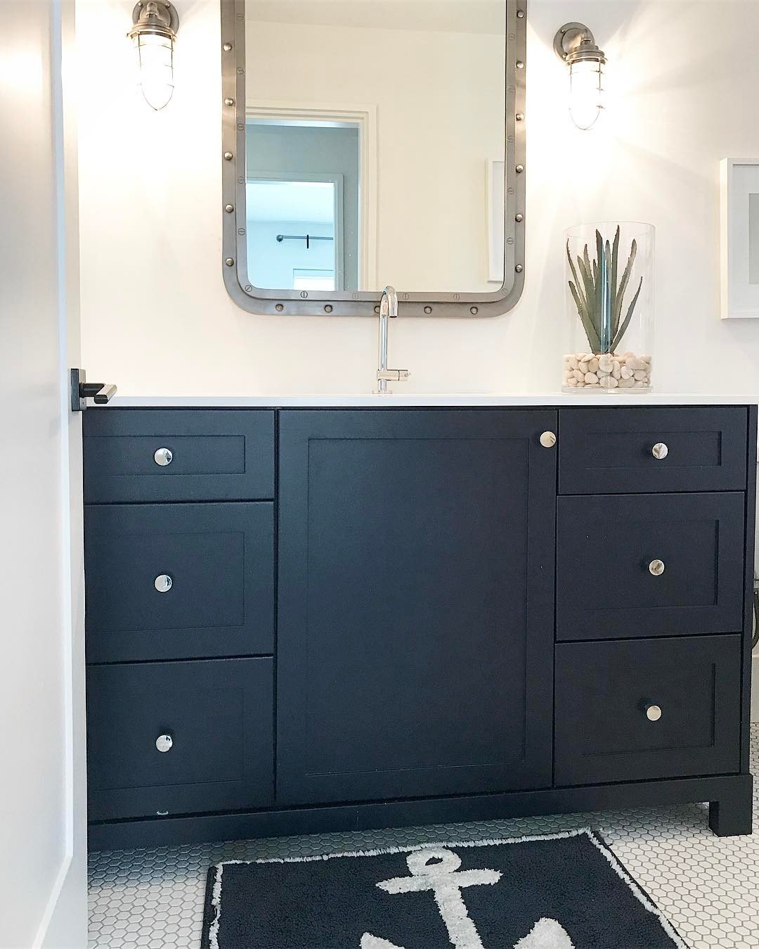 This one is super clean, but still sneaks in personality. The deep navy vanity paired with that industrial-style mirror brings just enough nautical edge.