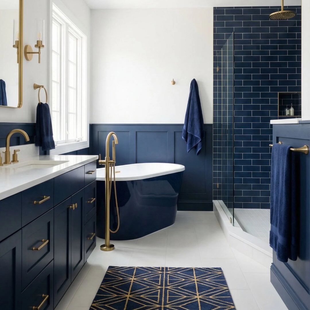 Now this is bold done right. The rich navy walls, matching tub, and gold fixtures create a look that feels both dramatic and super polished.