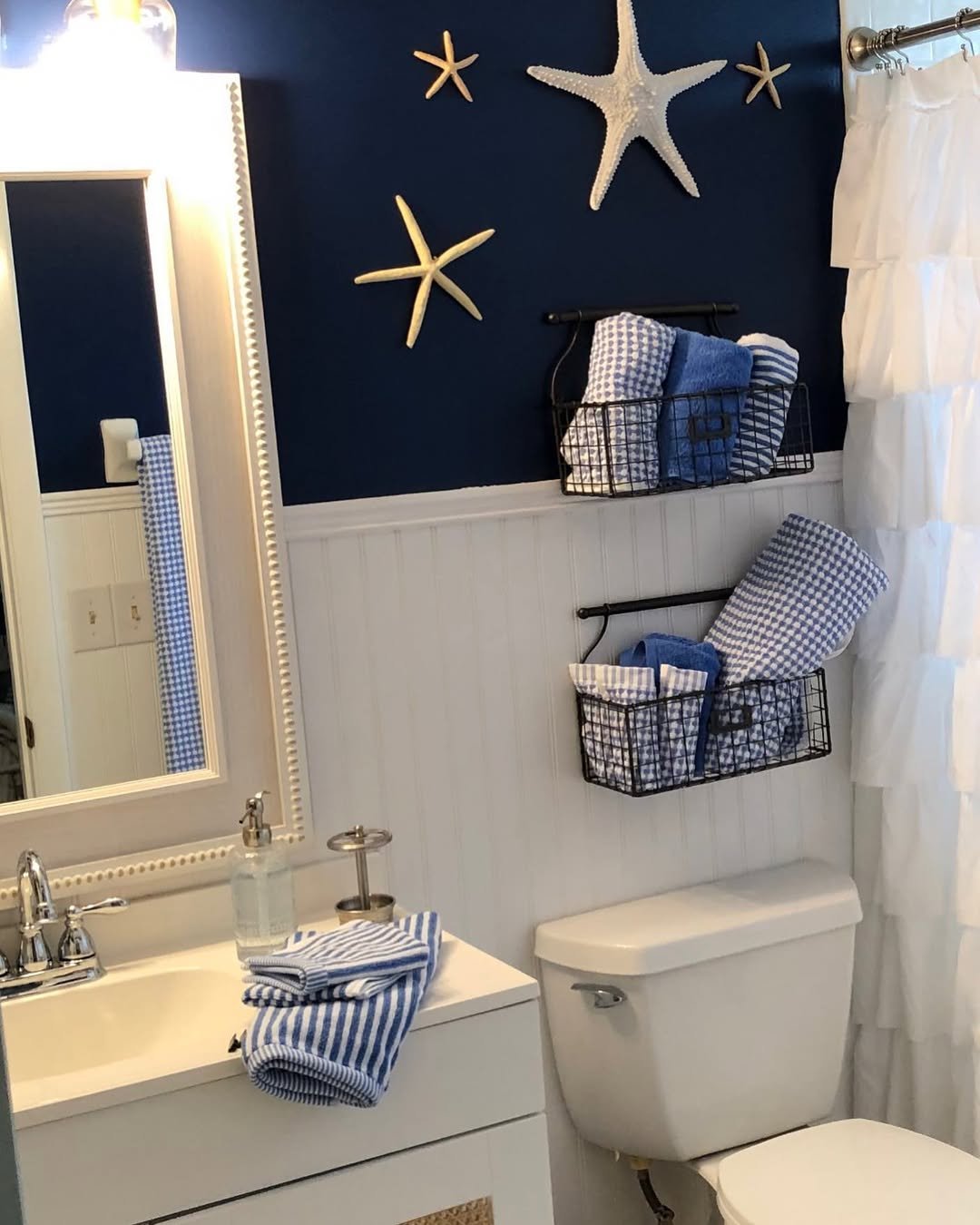 This one instantly gives beach house energy—but in a fun, lived-in way. The deep navy wall with starfish accents feels bold, while the gingham towels keep it playful and approachable.