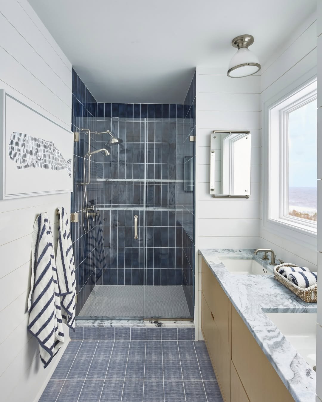 Those deep blue shower tiles instantly pull you in. Paired with white shiplap and marble, it’s a perfect balance of bold and clean.