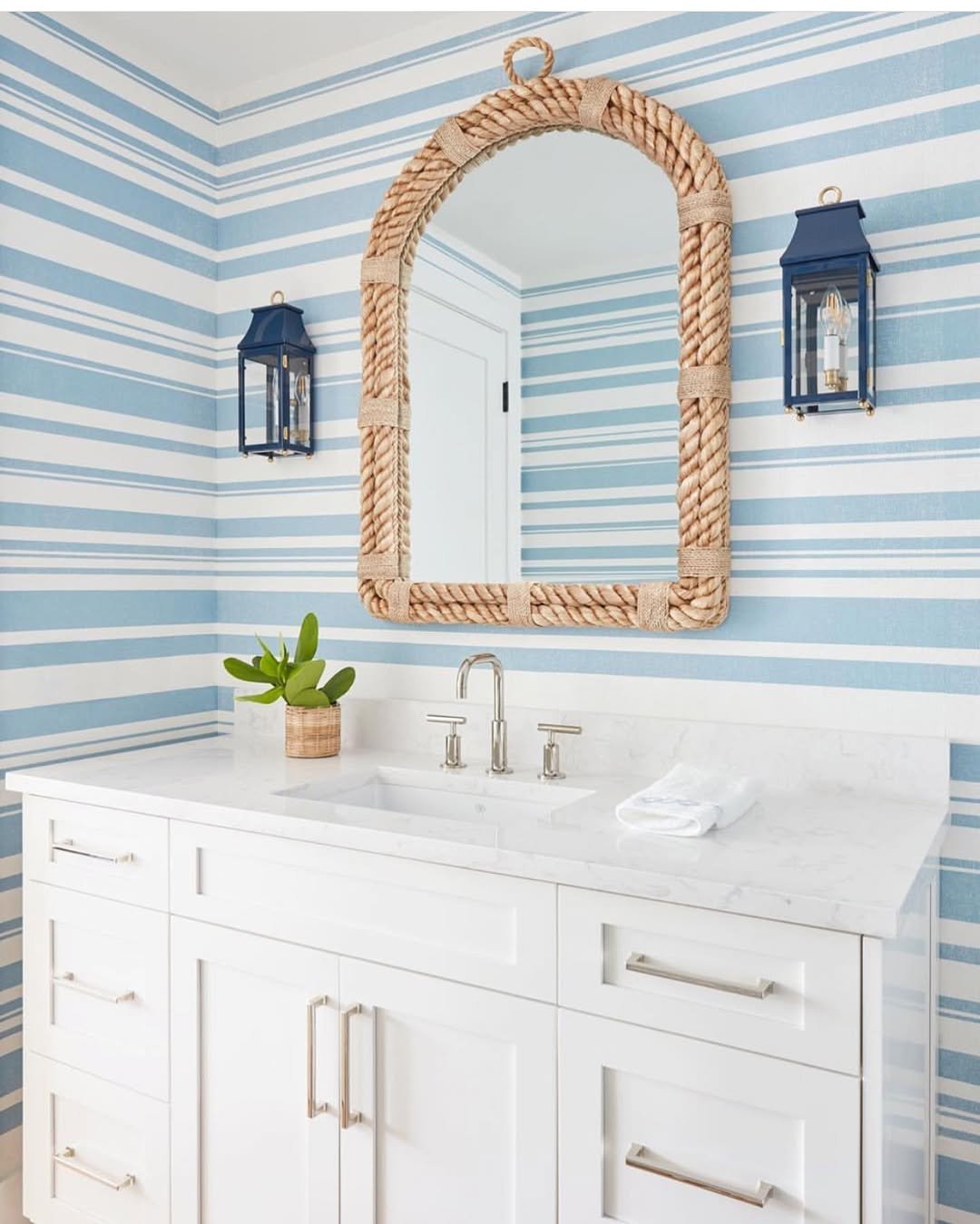 Okay this one has personality. The blue stripes and rope mirror instantly give off that playful beach house energy.