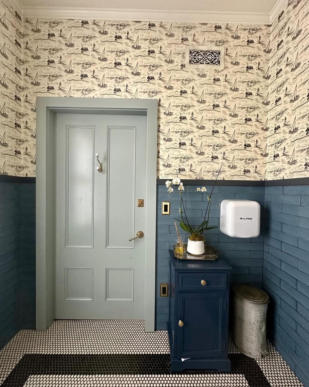 There’s something really charming about this mix of blue tile and illustrated wallpaper. It feels slightly old-school but still fresh.