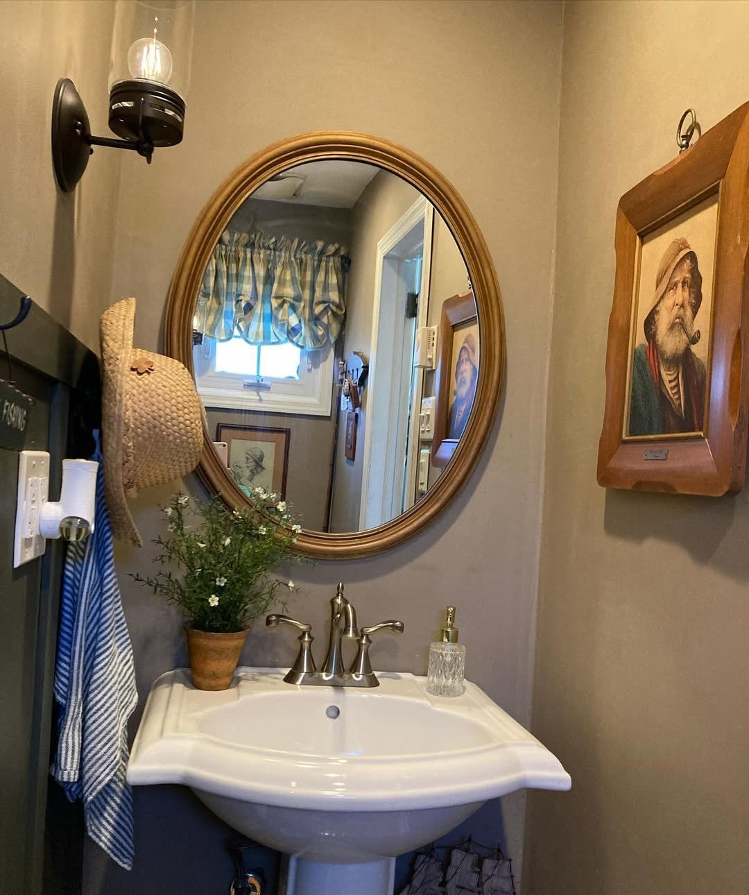 Okay this one is fun. The rope mirror, crossed paddles, and quirky decor give it a personality that feels straight out of a coastal cottage.