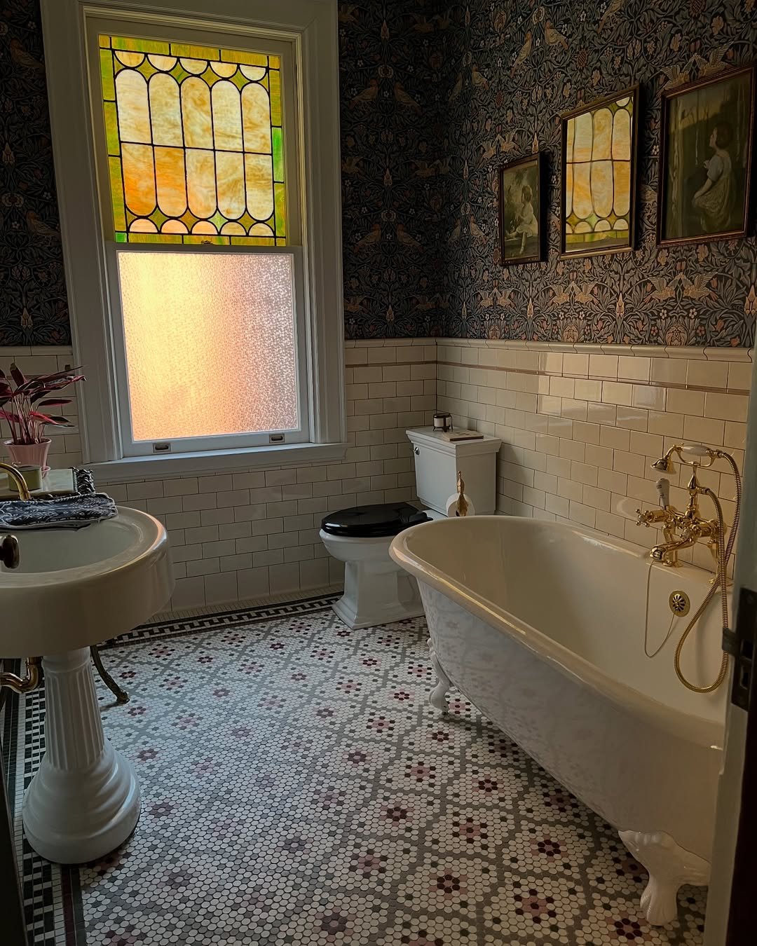 This one feels like stepping into a different era—in the best way. The stained glass, clawfoot tub, and intricate tile floor create this moody, almost nostalgic coastal vibe.