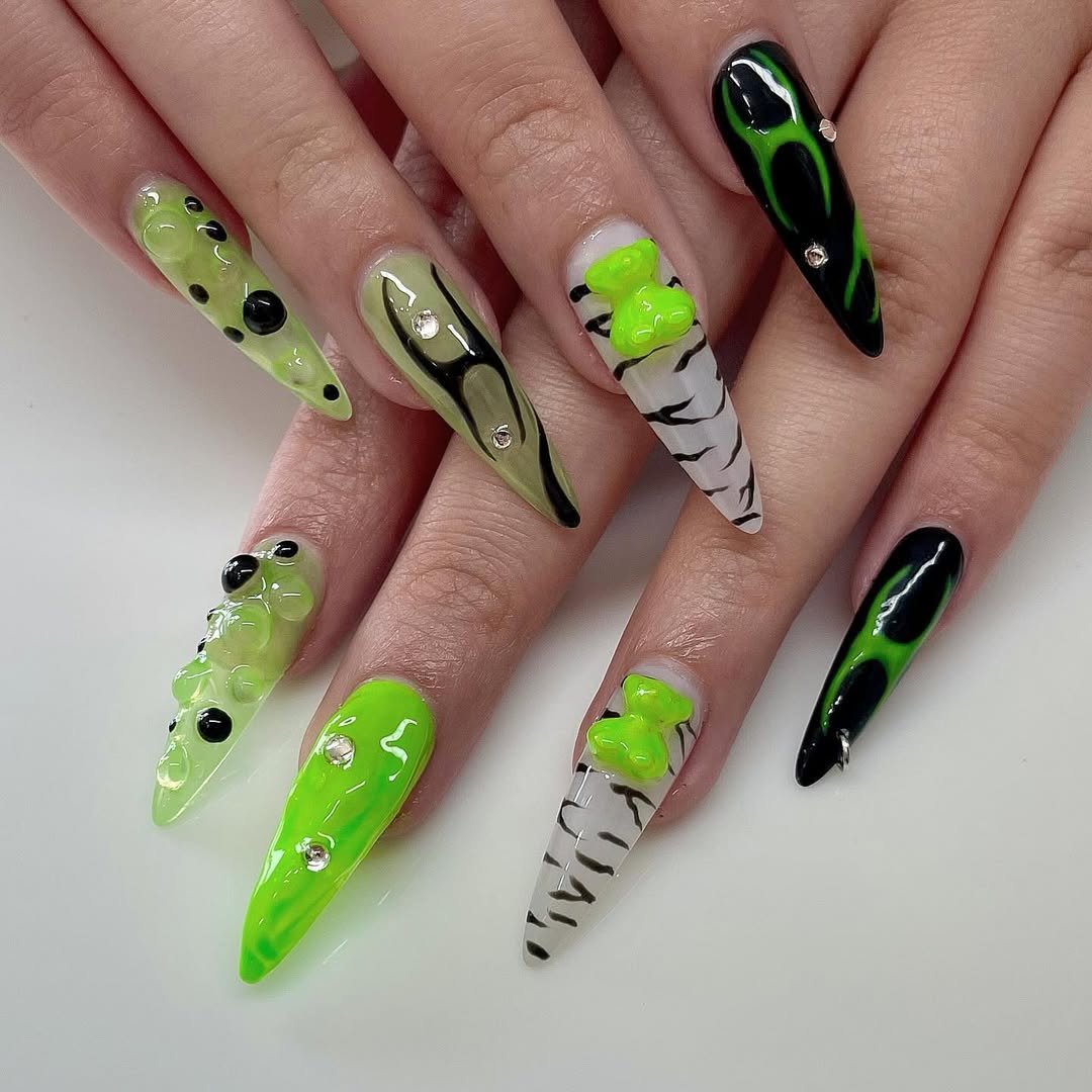 Every nail has its own weird little character—from gooey blobs to flame-like green shapes. It’s edgy, dramatic, and the kind of design that feels straight out of a futuristic nail art playground.