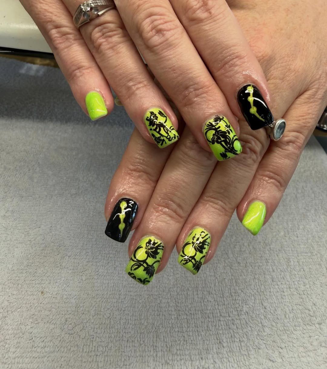 This manicure brings a darker, moodier spin to neon green nails. Glossy black polish pairs with lime green bases and delicate floral stamping that almost looks like vintage wallpaper patterns.
