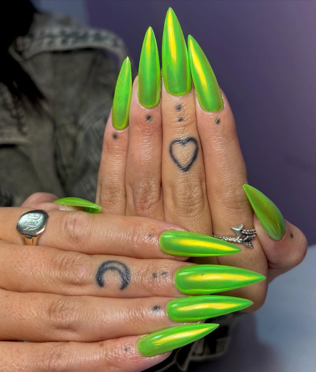 These nails take neon green into full futuristic territory. The reflective chrome finish shifts between lime, yellow, and metallic green depending on the light.